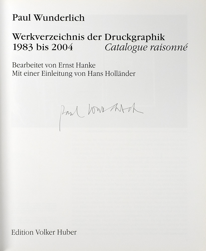 Wunderlich, Paul – Hanke, Ernst: Werkverzeichnis der Druckgraphik II 1983 bis 2004. Catalogue raisonné. Bearbeitet von Ernst Hanke. Mit einer Einleitung von Hans Holländer. [Signiertes Exemplar]. Offenbach am Main, Edition Volker Huber, 2005. Groß-4°. 35,5 x 29,5 cm. 224 Seiten. Original-Leinenband mit Original-Schutzumschlag. (= Paul Wunderlich: Das malerische, graphische und plastische Werk, Band VI).