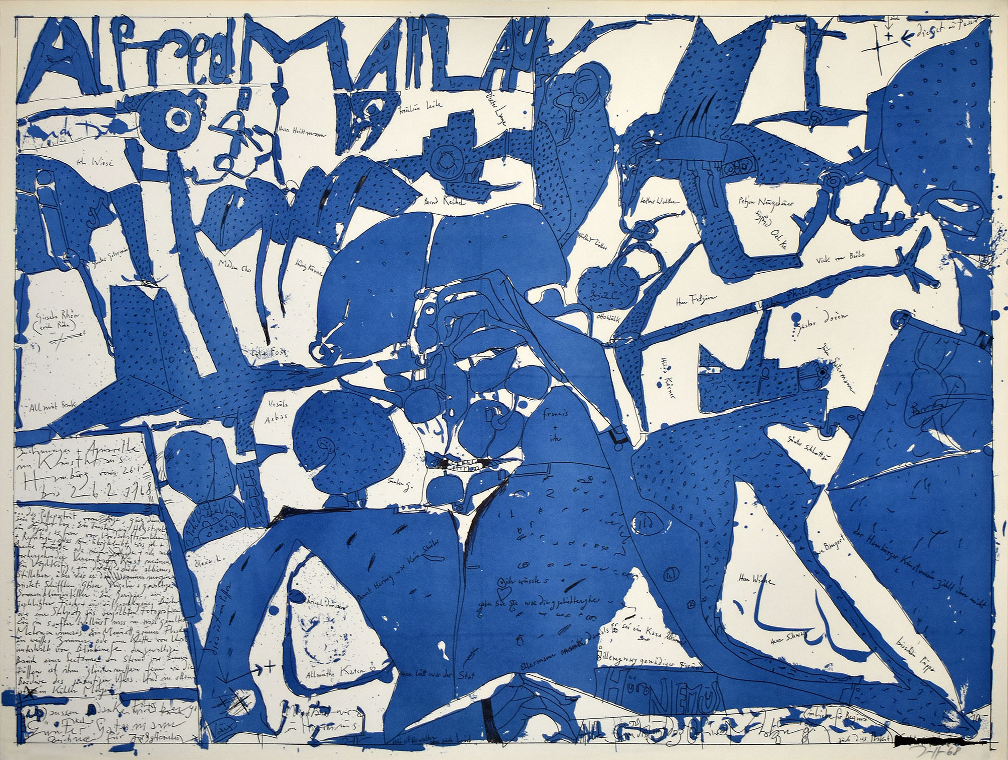 Original-Plakat (Strichätzung in zwei Farben) auf weißem Papier. Eins von ca. 1000 Exemplaren zur Ausstellung „Alfred Mahlau“ des Kunsthauses Hamburg, Januar-Februar 1968. Galerie Brockstedt, Hamburg, Dezember 1967-Januar 1968. Von Horst Janssen unterhalb der Abbildung in Blei signiert und datiert (68). Druck durch Christians, Hamburg. Werkverzeichnis Meyer-Schomann Nr. 32. Maße Blatt: 65 x 86 cm. Sehr gutes Exemplar.