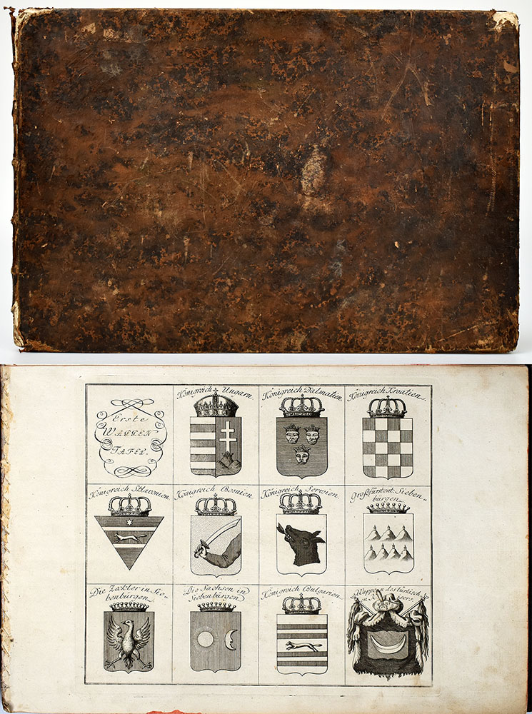 35 Kupfertafeln (Blattgröße: 41 x 28,5 cm; Plattengröße: 24,5 x 29 cm; Wappengröße: 8 x 7 cm), Tafel 1-22 und 24-36. Die Stärke der Drucke variiert etwas, verbleibt immer aber in klarem und sauberem Abdruck. Mit Originalradierung als Exlibris von Wilhelm Iven sowie einem Exlibris der Biblioteca Caproni. Einband berieben und mit Fehlstellen im Lederbezug, Ecken bestossen, nur sehr vereinzelt minimal stockfleckig, im Falz vor der 1. und zwischen der 33. und 34. Tafel etwas gelockert (Bindung ansonsten fest). Außen guter, innen sehr guter Zustand. Umfasst zahlreiche Kupferstiche historischer Wappen (darunter auch Phantasiewappen): 1. Wappentafel: Ungarn, Dalmatien, Kroatien, Sklavonien, Bosnien, Servien, Siebenbürgen, Die Zeckler in Siebenbürgen, Die Sachsen in Siebenbürgen, Bulgarien, Wappen des türkischen Kaisers. 2. Wappentafel: Walachey, Moldau, Kandien, Ragusa, Galizien, Lodomerien, Polen, Litauen, Kurland, Semgallen, Preussen. 3. Wappentafel: Stadt Danzig, Stadt Thorn, Russisches Reich, Liefland, Schweden, Dänemark, Norwegen, Schleßwig, England, Scotland, Ireland. 4. Wappentafel: Das heilige römische Reich, Böheim, Mähren, Oberlausitz, Niederlausitz, Schlesien, Neisse oder Grotkau, Brieg, Sagan, Münsterberg, Schweidnitz. 5. Wappentafel: Troppau, Jägerndorf, Jauer, Glogau, Oppeln Ratibor, Breslau, Liegnitz, Wohlau, Teschen, Oels. 6. Wappentafel: Glatz, Oestreich vormals und heute, Steyermark, Karnten, Krain, Görz, Tirol, Brixen, Trient, Breisgau. 7. Wappentafel: Burgau, Altorf in Schwaben, Salzburg, Bayern, Regensburg, Leuchtenberg, Passau, Sternstein, Haag, Ortenburg, Berchtesgaden. 8. Wappentafel: Windische Mark, Freisingen, Weissenhorn, Kirchberg, Regensburg, Obermünster, Hohenwaldeck, Gradissa, Albanien, Sonneberg, Brabant. 9. Wappentafel: Augsburg, Flandern, Ulm, Limburg, Aalen, Luxemburg, Biberach, Hennegau, Eßlingen, Mamur, Reutlingen. 10. Wappentafel: Bamberg, Nördlingen, Dornik, Antwerpen, Hall, Ellwangen, Geldern, Ueberlingen, Mecheln, Augsburg, Oettingen. 11. Wappentafel: Mindel, Konstanz, Fürstenberg, Lindau, Kempten, Hohenems, Kaufbeuern, Würtemberg, Basel, Wangen, Hohenzollern. 12. Wappentafel: Baaden, Rothweil, Thengen, Heilbronn, Klettgau, Gmünd, Teck, Memmingen, Werdenberg, Dinkelsbühl, Heiligenberg. 13. Wappentafel: Heydenheim, Ravensburg, Justingen, Kempten, Eberstein, Isny, Mahlberg, Leutkirch, Baadenweiler, Wimpfen, Sigmaringen. 14. Wappentafel: Gengebach, Königseck, Giengen, Kühlenthal, Pfullendorf, Waldburg, Buchhorn, Zell, Bopfingen, Salmansweiler, Offenburg. 15. Wappentafel: Franken, Würzburg, Eichstädt, Deutsche Orden Nürnberg, Wertheim, Thurn und Taxis, Rothenburg, Hohenwalde, Windsheim, Langenburg. 16. Wappentafel: Nürnberg, Henneberg, Gleichen, Castell, Rieneck, Erbach, Breuberg, Reichelsberg, Seinsheim Schwarzenberg. 17. Wappentafel: Schwaben, Schweinfurt, Buchau, Limburg, Neumüsnter, Maynz, Aremberg, Kölln, Prüm, Trier, Braindt. 18. Wappentafel: Pfalz, Emmeran, Beilstein, Lindau, Isenburg, Guttenzell, Veldenz, Kaisersheim, Zweybrücken, Heggbach, Westphalen. 19. Wappentafel: Worms, Wittgenstein, Machthal, Hessen, Speyer, Hersfeld, Weissenburg, Ziegenhayn, Strassburg, Katzenellenbogen, Fulda. 20. Wappentafel: Löwenstein, Weingarten, Wolfthal, Ochsenhausen, Lichtenberg, Petershausen, Falkenstein, Roth, Wartenberg, Roggenburg, Bretzenheim. 21. Wappentafel: Solms, Rothenmünster, Münzenberg, Werden, Königstein, Worms, Burscheid, Kyrburg, Speyer, Salm, Rheingrafenstein. 22. Wappentafel: Waldeck, Sponheim, Wettenhausen, Rappoltstein, Gegenbach, Hanau, Zwiefalten, Ochsenstein, Schussenried, Bitsch, Nassau. 24. Wappentafel: Frankfurt, Truchsess, Friedberg, Pyrmont, Wetzlar, Münster, Stromberg, Paderborn, Hoheneck, Lüttich, Geroldseck. 25. Wappentafel: Osnabrück, Ostfriesland, Corvey, Kölln, Jülich, Stablo, Berg, Malmedy, Kleve, Mörs, Aachen. 26. Wappentafel: Minden, Essen, Verden, Runkel, Wied, Sayn, Freusburg, Homburg, Schauenburg, Lippe, Schwalenberg. 27. Wappentafel: Oldenburg, Dortmund, Delmenhorst, Alpen, Sternberg, Rhede, Bentheim, Helfenstein, Steinfurt, Wevelinghofen, Tecklenburg. 28. Wappentafel: Erz Marschal Amt, Lingen, Hervorden, Hoya, Virnenburg, Scharpeneck, Diepholz, Bruchhausen, Rietberg, Manschlacht, Jever. 29. Wappentafel: Reichs Erz Schatzmeister Amt, Bronchorst, Witmund, Gronsfeld, Batenburg, Reckheim, Anholt, Blankenheim, Winnenburg, Fleckenstein, Wittem. 30. Wappentafel: Erz Kämmerer Amt, Schleiden, Magdeburg, Bremen, Lüneburg, Lübeck, Regenstein, Goslar, Halberstadt, Mühlhausen. 31. Wappentafel: Meckelburg, Nordhausen, Werden, Lübeck, Schwerin, Hamburg, Ratzeburg, Rostock, Hildesheim, Sturgard. 32. Wappentafel: Erz Pannier Amt, Holstein, Ranzau, Stormarn, Klettenberg, Ditmarsen, Leinigen, Dagsbrug, Westerburg, Mümpelgard, Eberstein. 33. Wappentafel: Rügen, Pommern, Kamin, Brandenburg, Stettin, Römhild, Naumburg, Tonna, Merseburg, Schwarzburg, Mark. 34. Wappentafel: Sachsen, Blankenburg, Thüringen, Meissen, Engern, Landsberg, Pleissen, Orlamünde, Magdeburg, Altenburg, Eisenberg. 35. Wappentafel: Ravensberg, Barby, Kniphausen, Ascanien, Bernburg, Ballenstädt, Waldersee, Warmsdorf, Mühlingen, Anhalt, Nienburg. 36. Wappentafel: Erz Stallmeister Amt, Brehna, Cassuben, Pfalz zu Sachsen, Quedlinburg, Arnstadt, Wuerfurt, Sonderhausen, Mansfeld, Lohra, Hohnstein.