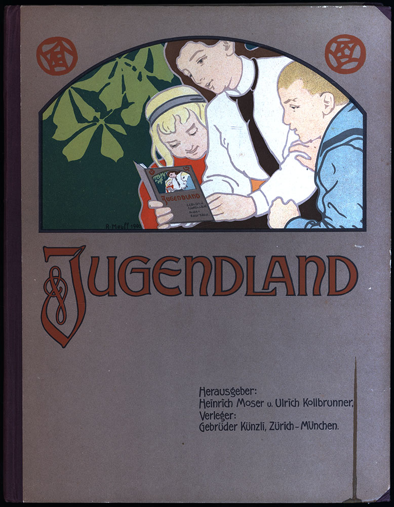 Moser, Heinrich [Hrsg.]; Kollbrunner, Ulrich [Hrsg.]: Jugendland. Ein Buch für die junge Welt und ihre Freunde. Unter Mitwirkung zahlreicher Künstler, Dichter und Dichterinnen aus allen Ländern deutscher Zunge herausgegeben. Band 2 [von 2]: Für Kinder von acht bis zwölf Jahren. Zürich [u.a.], Verlag Gebrüder Künzli, [1903]. 4°. 32 x 25 cm. 64 Seiten, 1 Blatt. Klammergehefteter Original-Halbleinenband mit farbiger Deckelillustration und Rundum-Rotschnitt sowie farbig illustrierten Vorsätzen.