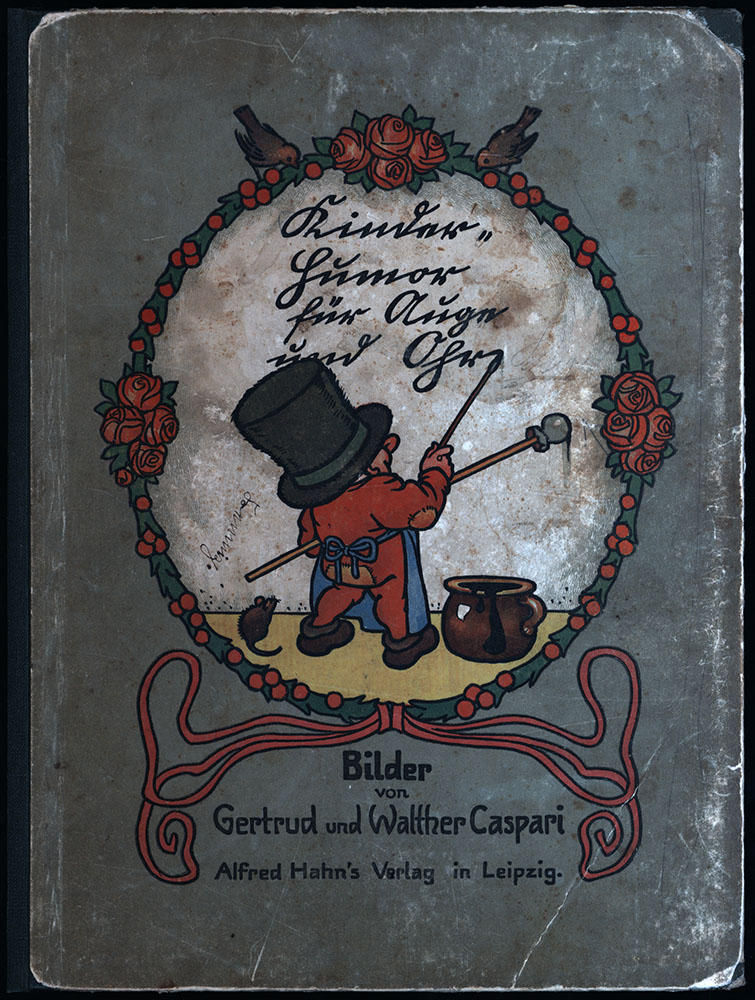 Caspari, Gertrud un dWalther: Kinderhumor für Auge und Ohr. 11. bis 20. Tsd. Leipzig, Hahn Verlag, 1906. 4°. 30,5 x 22,5 cm. 42 Seiten. Original-Halbleinenband mit farbiger Deckelillustration und farbig illustrierten Vorsätzen.