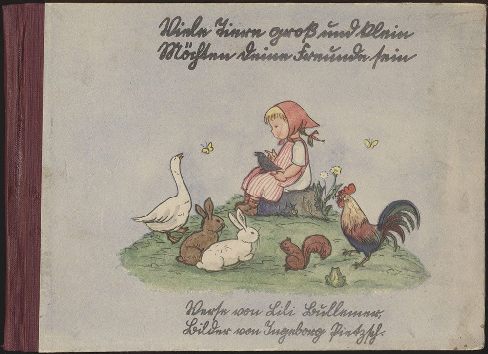 Bullemer, Lili und Pietzsch, Ingeborg: Viele Tiere groß und klein möchten deine Freunde sein. München, Hugendubel Verlag, [1942]. Quer-8°. 18 x 25 cm. 15 Blatt. Klammergehefteter Original-Halbleinenband mit farbiger Deckelillustration.