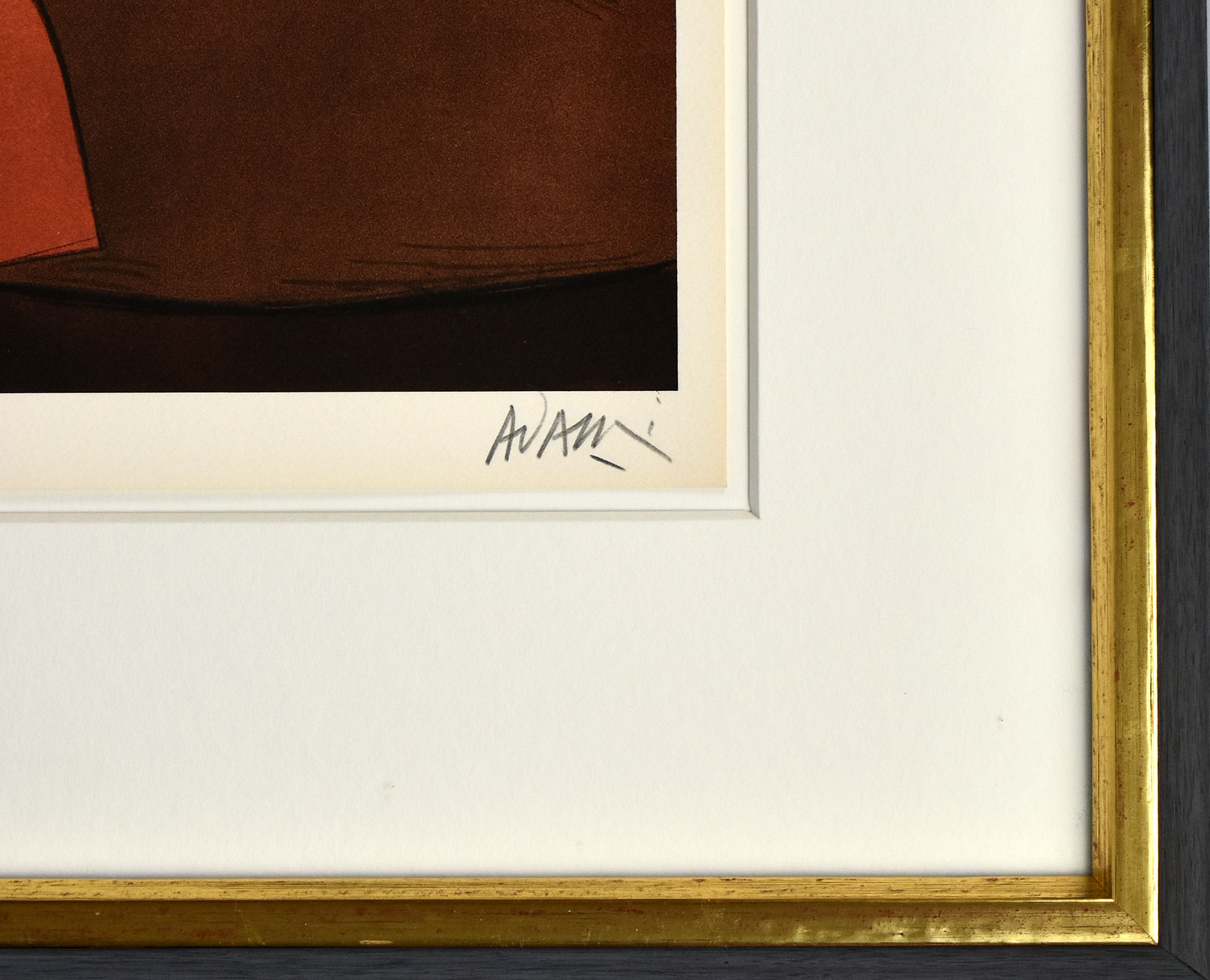 Nummer 3081 von 10000 nummerierten Original-Farblithografien. Unterhalb der Abbildung von Valerio Adami in Blei signiert. Blatt aus „Die Kunst der Grafik“, Offenbach 1982. Professionell hinter Glas im Passepartout im teils vergoldeten Holzrahmen gerahmt. Maße Rahmen: 63,0 x 50,5 cm. Maße Blatt: 42,0 x 30,0 cm. Maße Abbildung: 39,0 x 28,0 cm. Rahmenrückseite fleckig. Sehr gutes Exemplar.