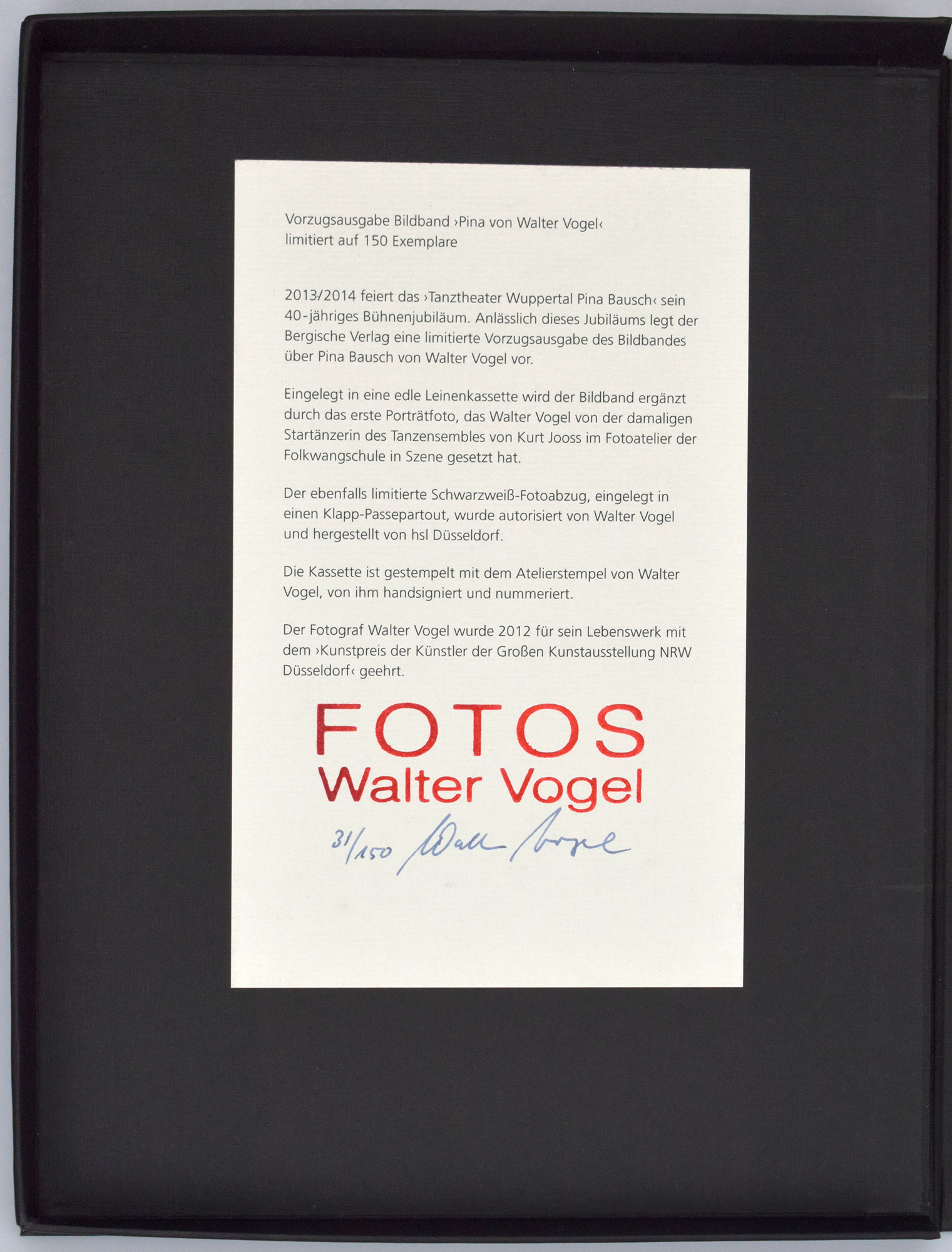 Vogel, Walter: Pina. [Nummeriertes Exemplar ; mit beiliegender Original-Fotografie]. Remscheid, Bergischer Verlag, 2013. 4°. 28 x 21 cm. 133 Seiten. Original-Leinenband in Original-Leinenkassette.