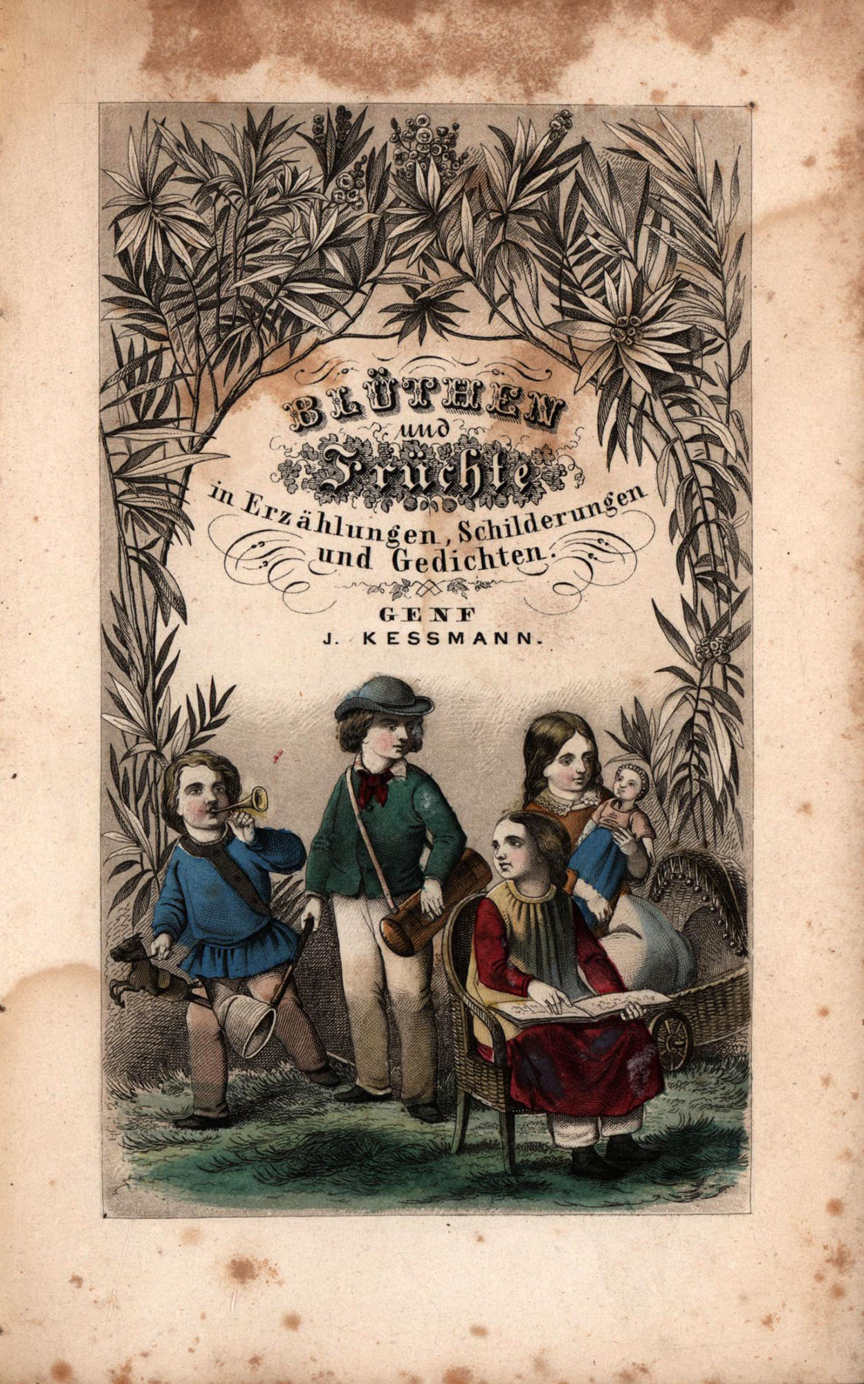 Adrien, E. G. [Hrsg.]: Blüthen und Früchte. 212 Erzählungen, Beschreibungen und Gedichte. Gesammelt und herausgegeben von E. G. Adrien. Mit 8 colorirten Stahlstichen. Genf, Deutsche Buchhandlung von J. Keßmann, 1858. 8°. 19,5 x 13 cm. XIV, 286 Seiten. Gebundener Pappband der Zeit.