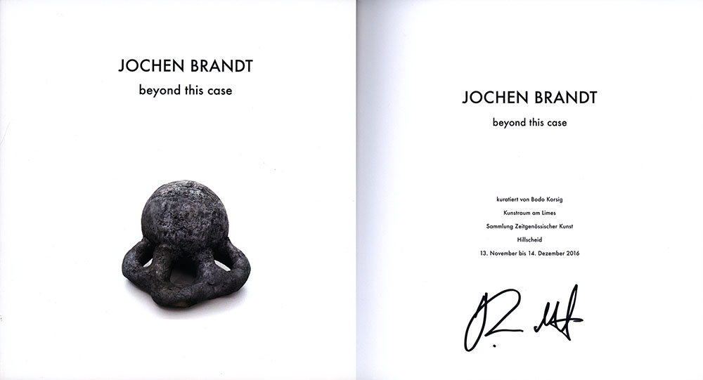 Brandt, Jochen: beyond this case. Kuratiert von Bodo Korsig. [Signiertes Exemplar / signed copy]. Hillscheid, Kunstraum am Limes, 2016. 4°. 26,5 x 25 cm. 60 Seiten. Original-Broschur.