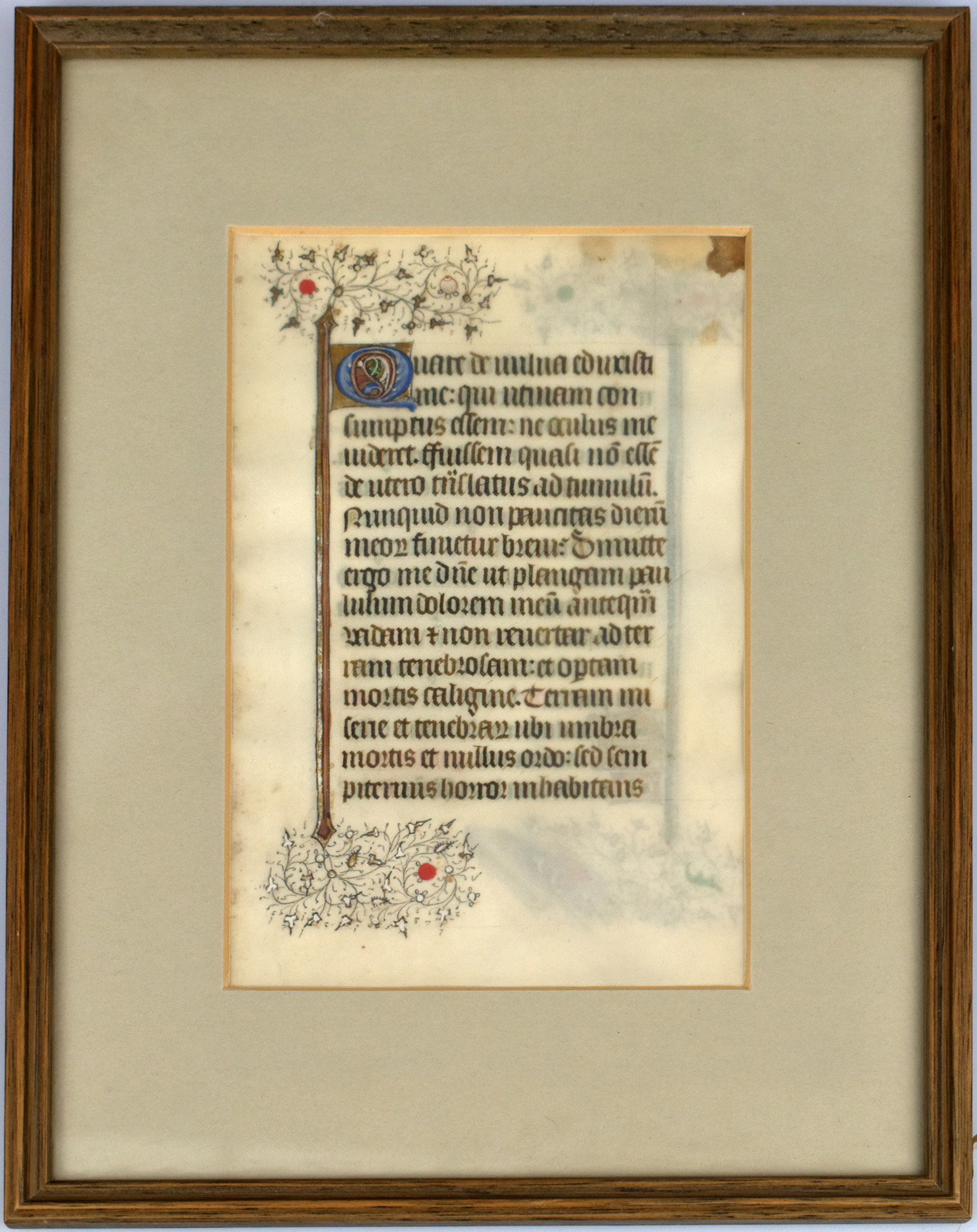 Handschrift aus einem Stundenbuch des 14.-15. Jahrhunderts auf Pergament. 15 zeiliger Text in einer schönen, schwarzen Gothica, farbig gestaltete Eingangs-Initiale Q an einer goldgehöhten Fahne, Fahnenstange und floraler Schmuck ebenfalls teils goldgehöht. Pergament beidseitig beschriftet. Professionell hinter Glas/Passepartout im einfachen Holzrahmen gerahmt. Nicht ausgerahmt. Maße Rahmen: 26,5 x 19,5 cm. Maße Abbildung: 15,0 x 8,5 cm. Blatt in einer Ecke mit Fleck. Sehr guter Zustand.