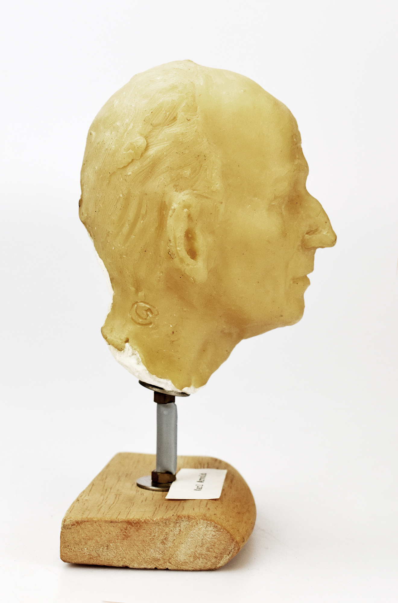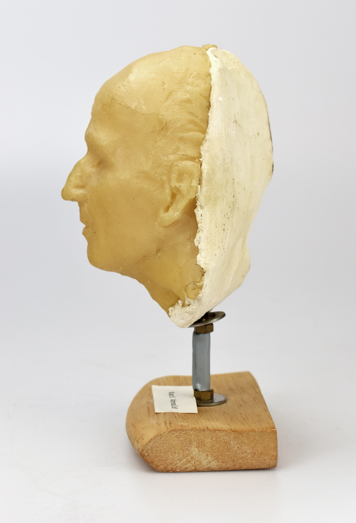 Wax model, cast in plaster, mounted on a wooden panel. Fragment of the head of Karl Arnold, former Minister President of North Rhine-Westphalia. Signature stamp of Bert Gerresheim on the neck. Provenance: From the collection of Wilhelm Blasberg, acquired by Bert Gerresheim in 2012. Dimensions: 12 x 9 x 8 cm. Weight: 450 g. Very good condition.