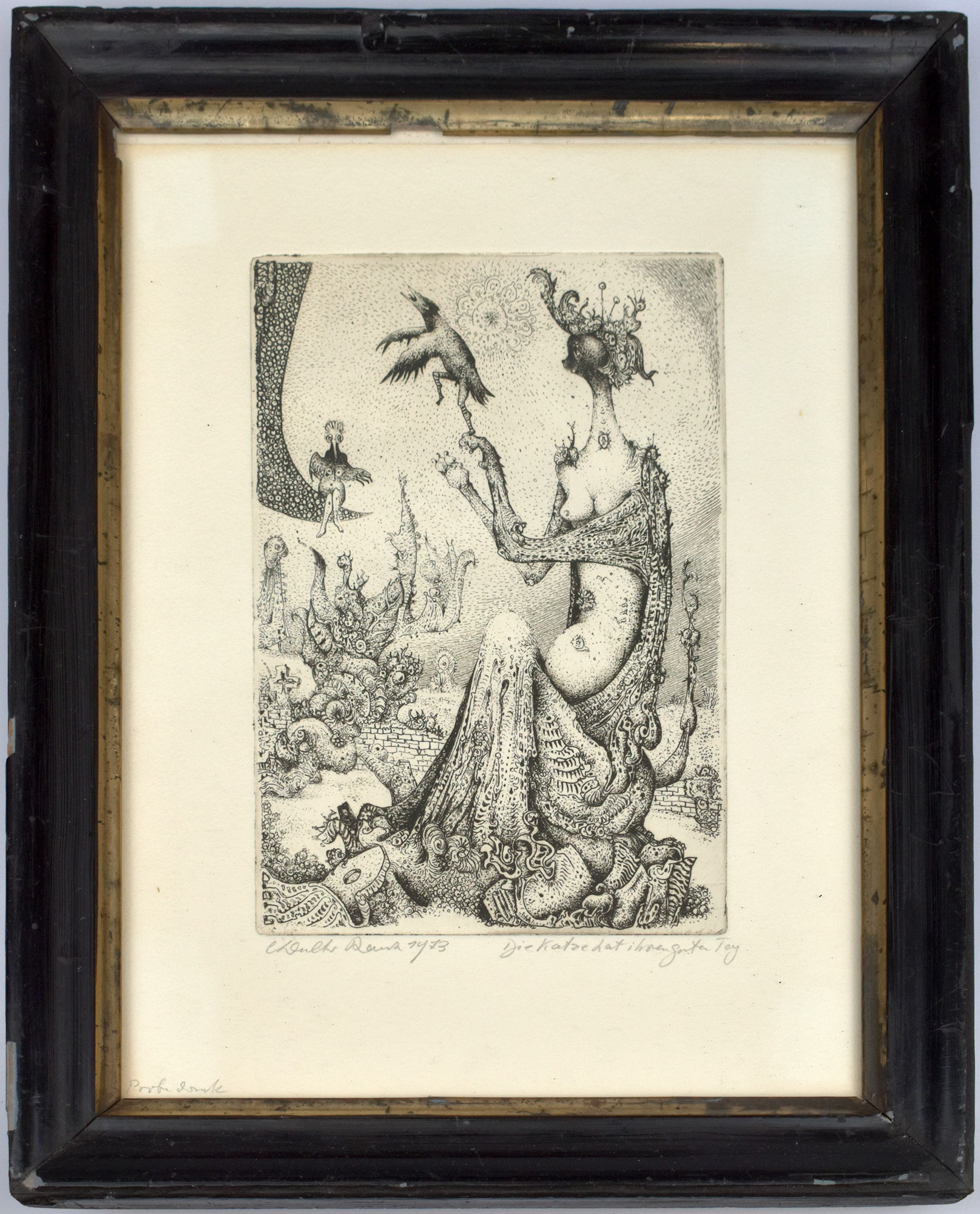 Rauh, Caspar Walter: Die Katze hat ihren guten Tag. 1973. [Signierte Original-Radierung, gerahmt / signed original etching, framed]. (Caspar Walter Rauh, geboren am 13. Oktober 1912 in Würzburg, gestorben am 7. Oktober 1983 in Kulmbach. Deutscher Zeichner, Grafiker und Maler, Vertreter des Phantastischen Realismus. Studium ab 1932 an der Kunstakademie Düsseldorf bei Werner Heuser und Heinrich Nauen. 1934/35 verbrachte er einige Monate in Amsterdam im Kreis ehemaliger Paul Klee- und Bauhaus-Schüler, ab 1936 setzte er sein Kunststudium an der Akademie Leipzig bei Walter Tiemann fort.