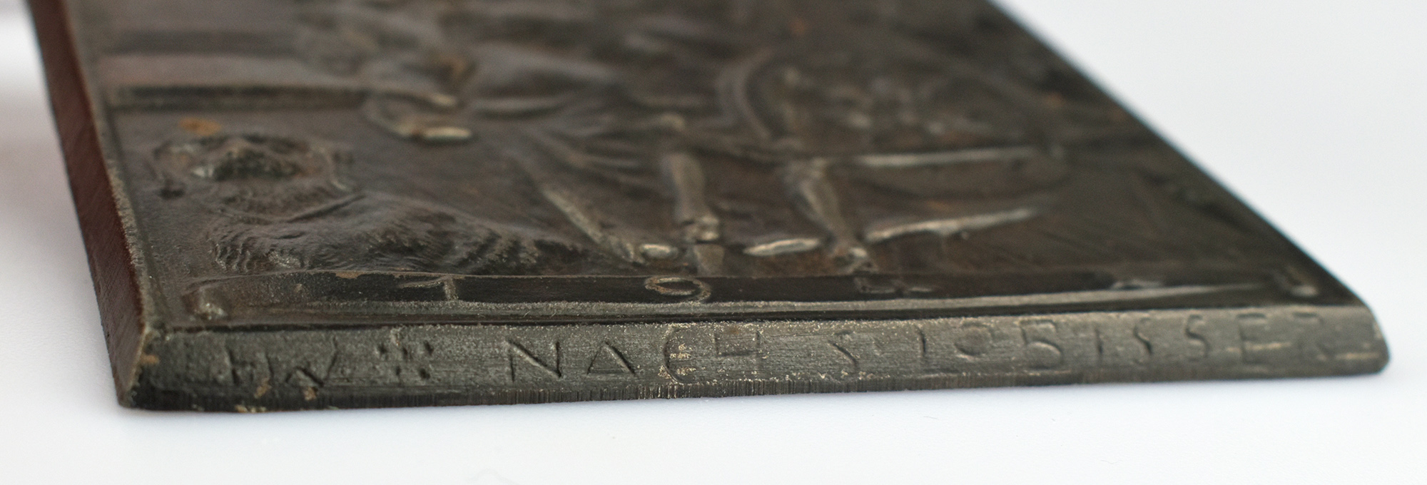Blackened cast iron relief, issued by the Lauchhammer art foundry in 1942. Monogrammed with „HZ“ on the side and inscribed „Nach S. Lobisser.“ The front is inscribed „Feldpost“ at the top, with the year stamped below and the „Lauchhammer foundry stamp“ to the right. Mounted on the back. Dimensions: 14.3 x 9.0 cm. Weight: 186 g. Very good copy.