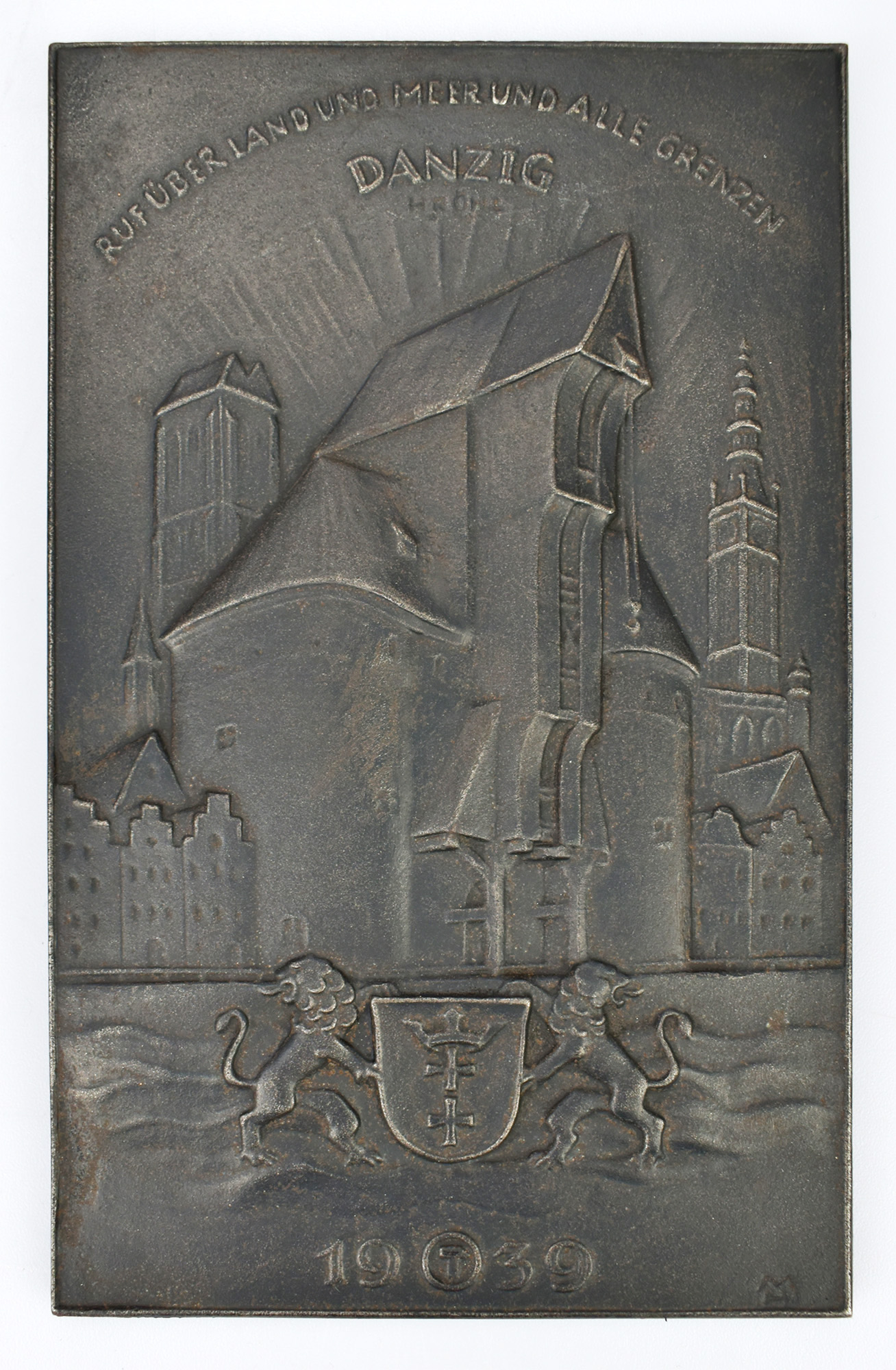 Moshage, Heinrich: Ruf über Land und Meer und alle Grenzen Danzig. 1939. [Eisengußrelief / Cast iron relief]. (Heinrich Friedrich Moshage, geboren am 12. November 1896 in Osnabrück, gestorben am 10. März 1968 in Düsseldorf. Deutscher Bildhauer, Holzschnitzer, Zeichner und Medailleur).