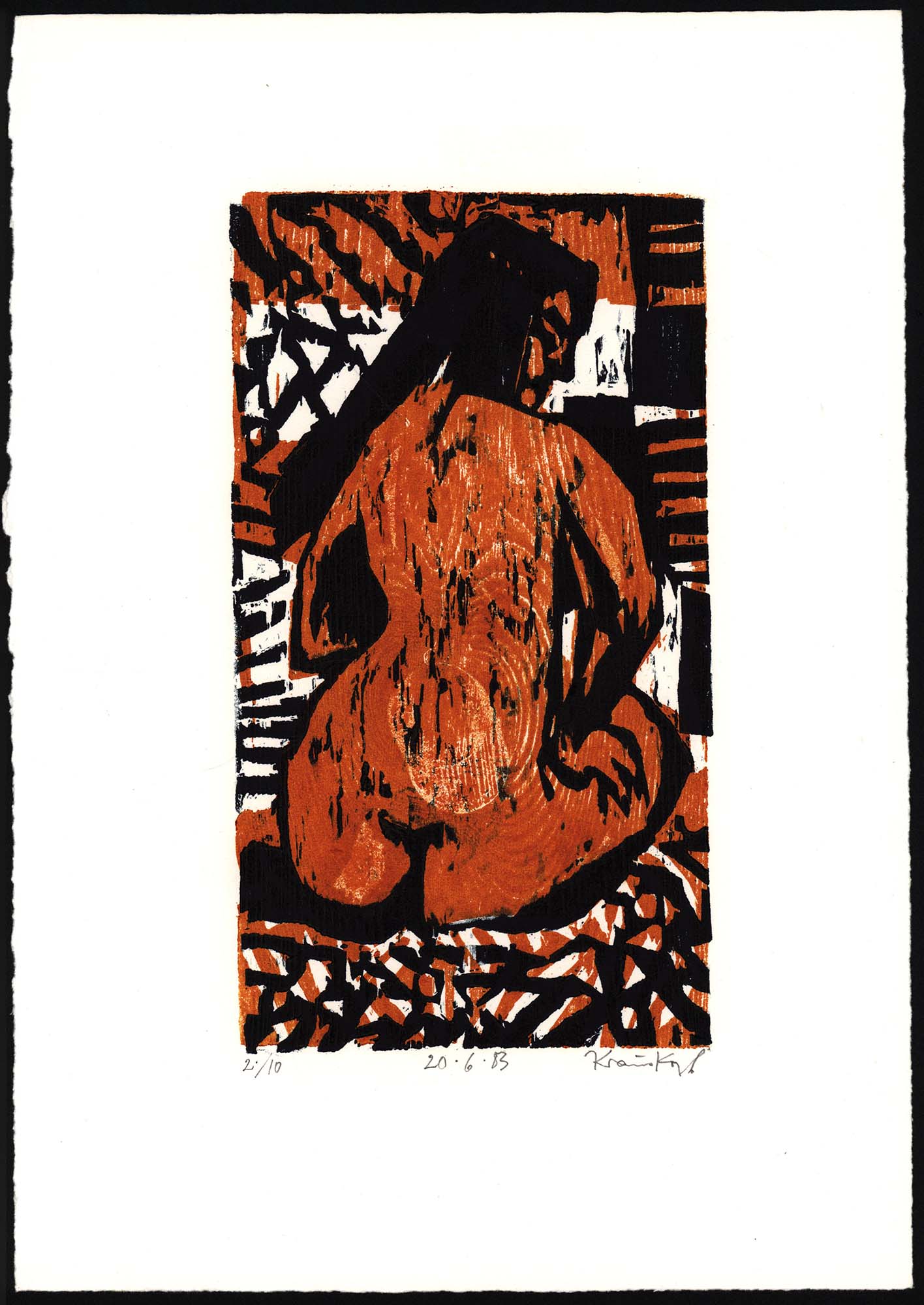 Krauskopf, Karl Heinz: Sitzender Rückenakt in Orange und Schwarz. 20.6.83. [Signierter Original-Farbholzschnitt / signed original color woodcut]. (Karl Heinz Krauskopf, geboren am 15. Mai 1930 in Ratingen, gestorben am 22. Januar 1984 ebenda. Deutscher Künstler. Studium 1947 bis 1951 an der Kunstakademie Düsseldorf bei Werner Heuser, Bruno Goller, Richard Schreiber und Heinz May. 1968 Heirat mit der Bildhauerin Gretel Gemmert).