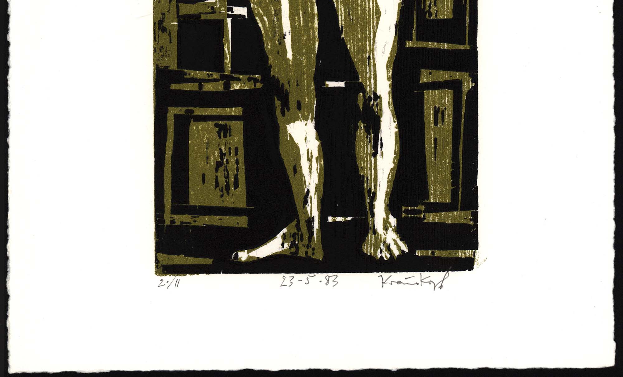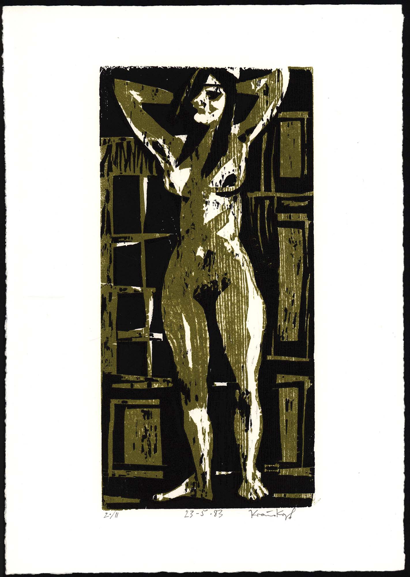 Krauskopf, Karl Heinz: Stehender Akt in Grün und Schwarz. 23.5.83. [Signierter Original-Farbholzschnitt / signed original color woodcut]. (Karl Heinz Krauskopf, geboren am 15. Mai 1930 in Ratingen, gestorben am 22. Januar 1984 ebenda. Deutscher Künstler. Studium 1947 bis 1951 an der Kunstakademie Düsseldorf bei Werner Heuser, Bruno Goller, Richard Schreiber und Heinz May. 1968 Heirat mit der Bildhauerin Gretel Gemmert).