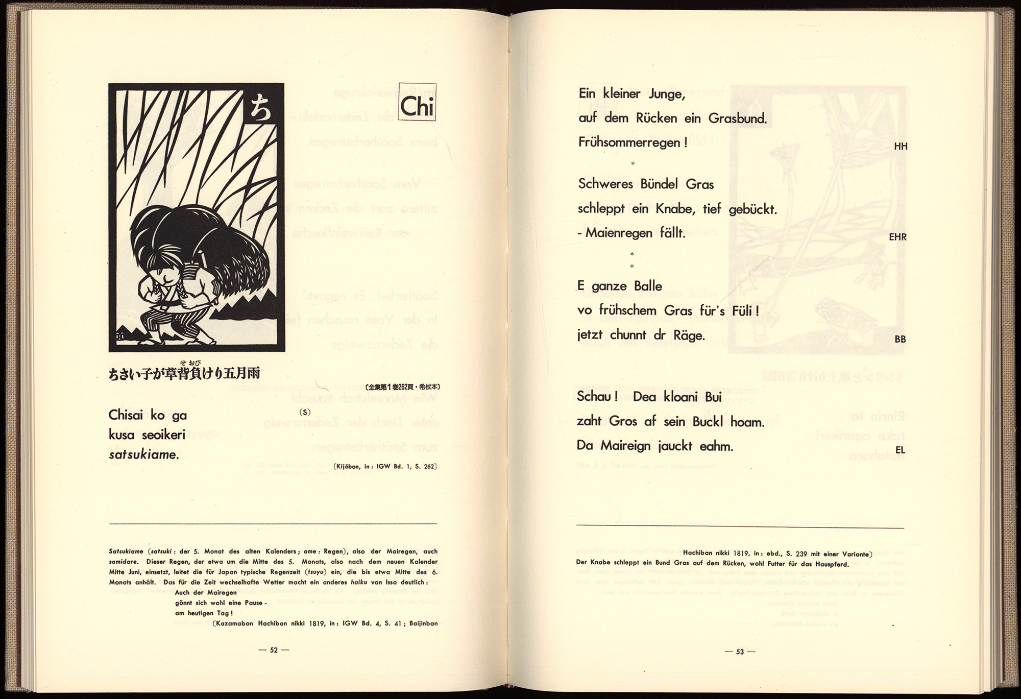 Kobayashi, Issa: Issa. Übersetzung mit Kommentar und Nachdichtung deutscher Dichter und japanischen Scherenschnitten. Herausgegeben von Hachiro Sakanishi. Unter Mitarbeit von Shozo Miyawaki und Horst Hammitzsch. Scherenschnitte von Kyoko Yanagisawa. Nagano, Shinano Mainichi Schimbun, 1982. 4°. 27 x19 cm. 164 Seiten. Original-Leinenband im Original-Pappschuber.