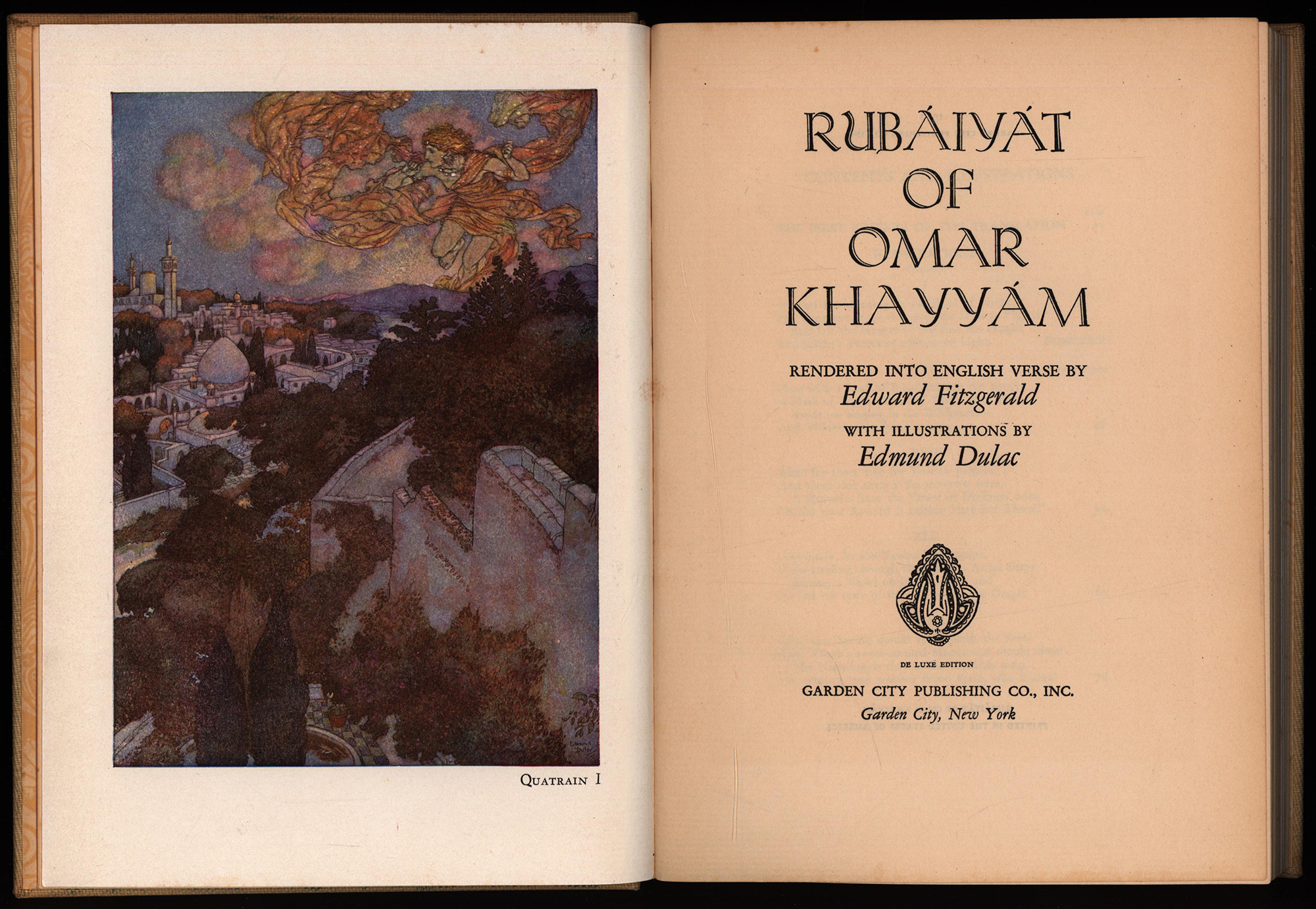 Khayyam, Omar: The Rubaiyat of Omar Khayyam. Rendered into English verse by Edward Fitzgerald. With illustrations ba Edmund Dulac. Garden City, NY, Garden City Books, 1937. Groß-8°. 24 x 18 cm. XXXVIII, 197 Seiten. Illustrierter Original-Leinenband mit goldgeprägtem Rückentitel und Kopfgoldschnitt.