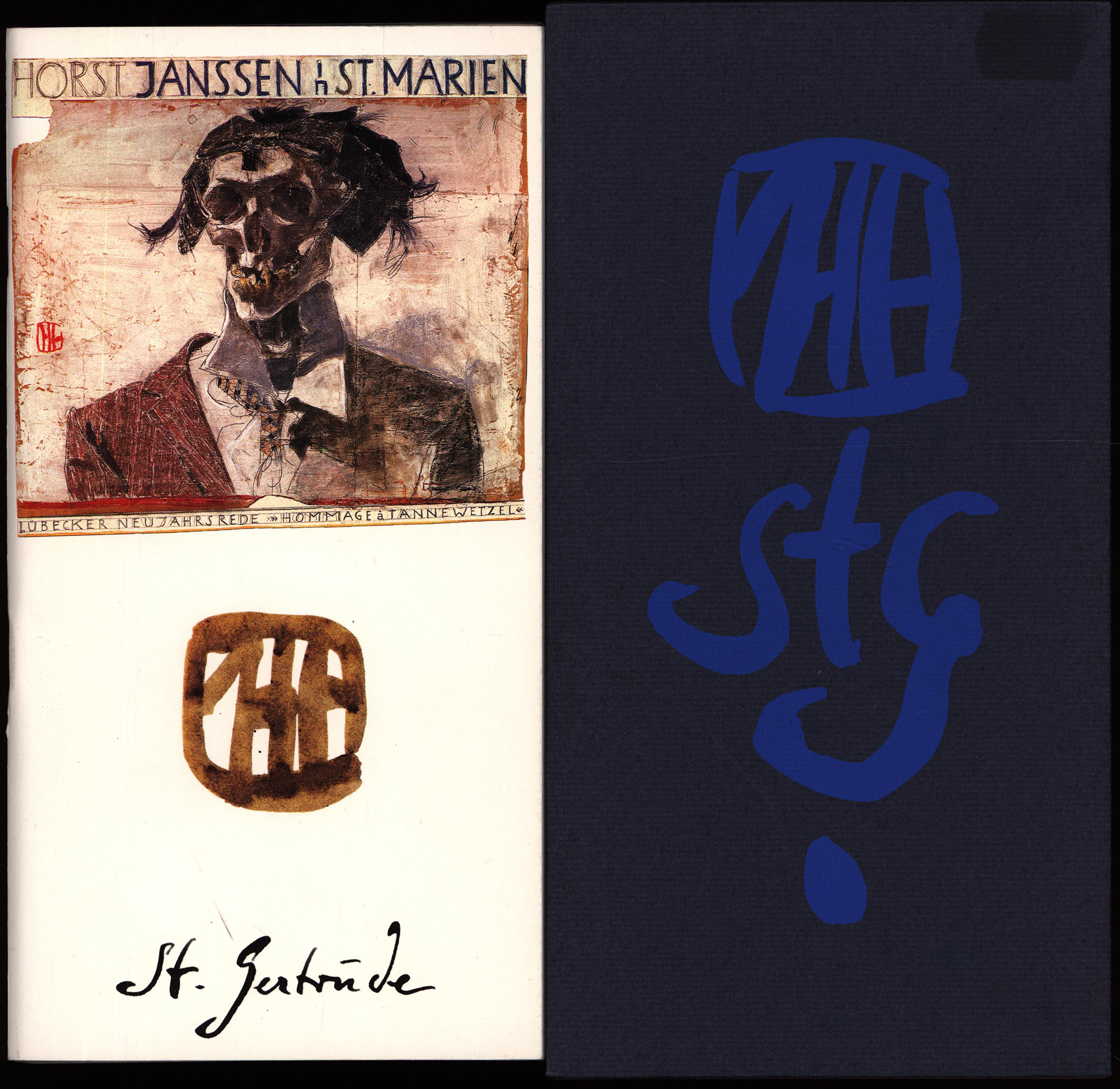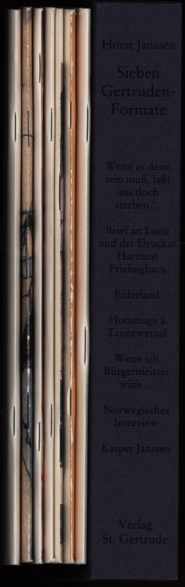 Janssen, Horst: Sieben Gertruden-Formate. Gertrudenformat I: „Wenn ich Bürgermeister wäre…“ Band II: Brief an Lucie und der Drucker Hartmut Frielinghaus. Band IIII: Eiderland. Band IV: Hommage a Tannewetzel. Band V: Wenn es denn sein muss, laßt uns sterben. Band VI: Norwegisches Interview. Band VII: Kaspar Jannsen. 7 Bände (komplett). [Signiertes Exemplar]. Hamburg, Verlag St. Gertrude / Hamburger Bücherstube Felix Jud / Deutscher Bücherbund, 1984-86. 8°. 25 x 14 cm. Ca. 300 Seiten. Original-Broschuren im illustrierten Pappschuber.