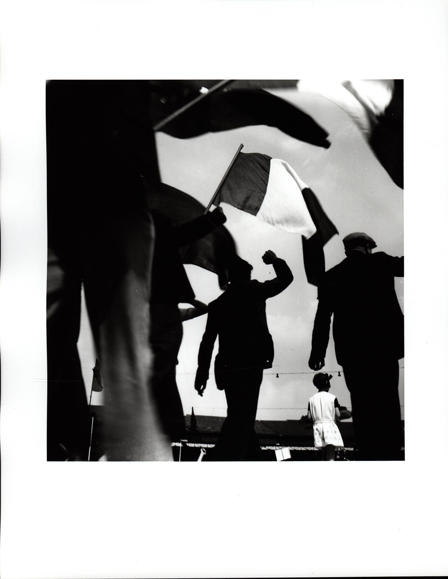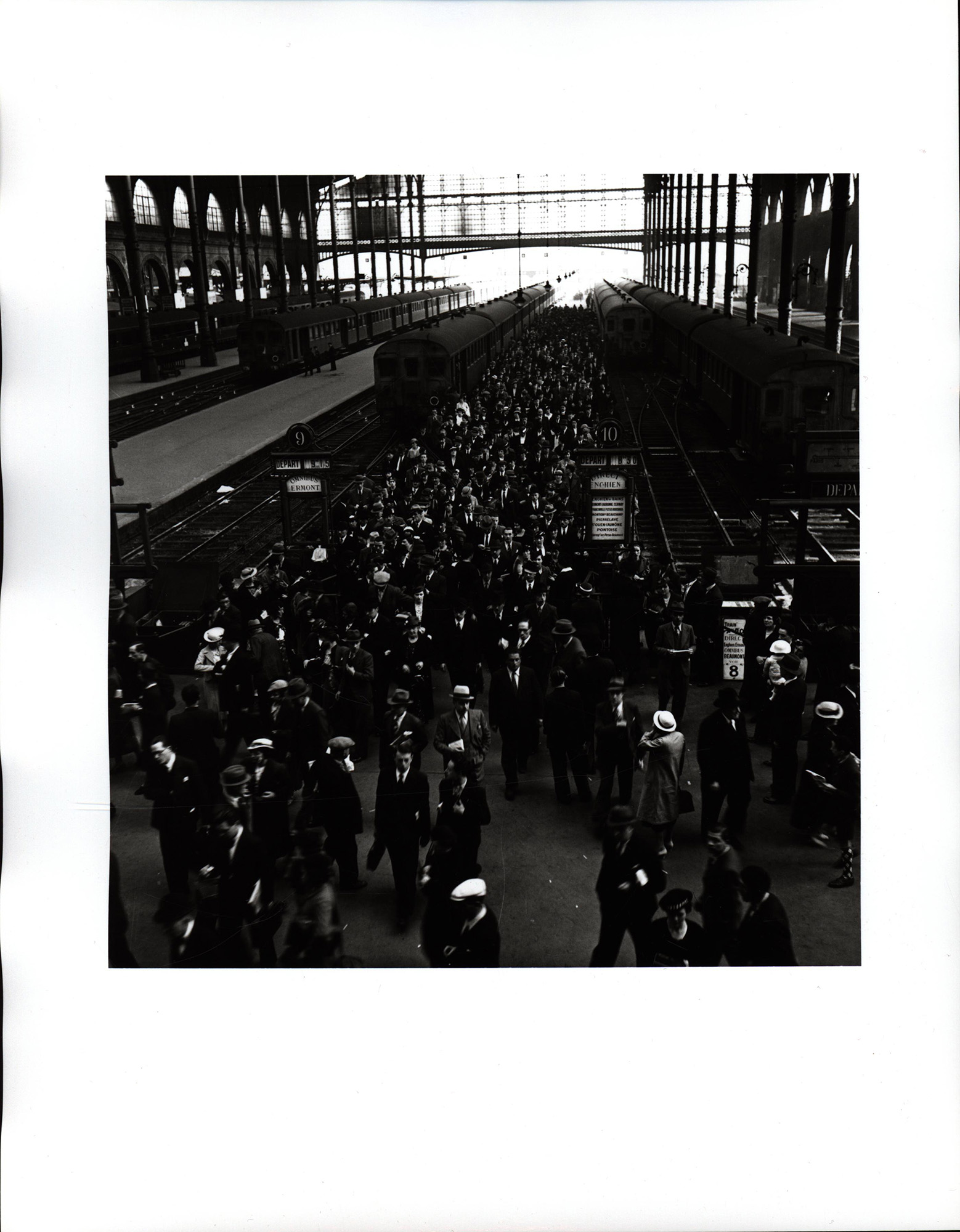 4 (of) original photographs in black and white, silver gelatin prints on Bergger Prestige warm tone baryta paper, produced from the estate of Re Soupault/Manfred Metzner by Larry Lazarus, Hamburg. In original folder, archival cardboard with linen spine produced by Christian Zwang, Hamburg, with enclosed 8-page text by Inge Herold and the following photographs: 1. St. Lazare station, Paris, 1936. 2. St. Lazare station, Paris, 1936. 3. Celebration of the election victory of the Popular Front under Léon Blum, striker delegations, Paris, June 14, 1936. 4. Celebration of the election victory of the Popular Front under Léon Blum, strikers, Paris, June 14, 1936. One-time edition for the Griffelkunst-Vereinigung, Hamburg, 2011. Typographically inscribed on the verso. Griffelkunst, Catalogue of Editions 343 B3-B6. Sheet dimensions: 30.5 x 24.0 cm. Image dimensions (slightly vary): approximately 19.4 x 18.8 cm. The portfolio originally consisted of 6 photographs; 2 photographs have been removed. Photographs in very good, immaculate condition.