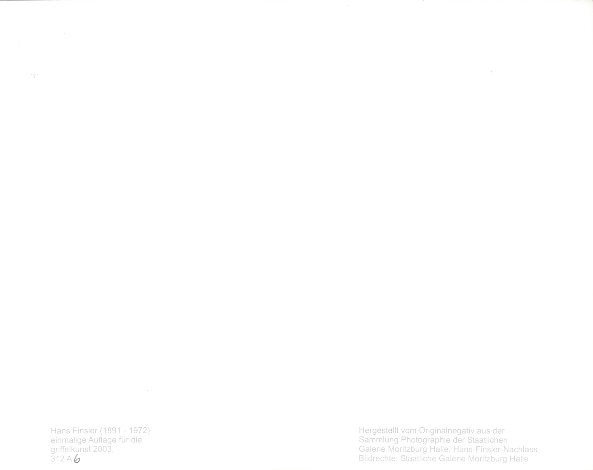 6 Originalfotografien in Schwarz-Weiß. Hergestellt von den Originalnegativen aus der Sammlung Photographie der Staatlichen Galerie Moritzburg Halle, Hans Finsler Nachlass. Einmalige Auflage für die Griffelkunst Hamburg, 2003. Rückseitig mit typografischer Beschriftung versehen. Serie in einer Mappe mit Leporello, 6-seitigem begleitenden Text von T. O. Immisch. Griffelkunst, Verzeichnis der Editionen 312 A1-A6. Maße Blätter: 30,4 x 24,0 cm (bzw. 24,0 x 30,4 cm). Abbildungen in unterschiedlichen Formaten. Die Textilschließen der Mappe wurden entfernt, Fotografien in sehr gutem, tadellosem Zustand.