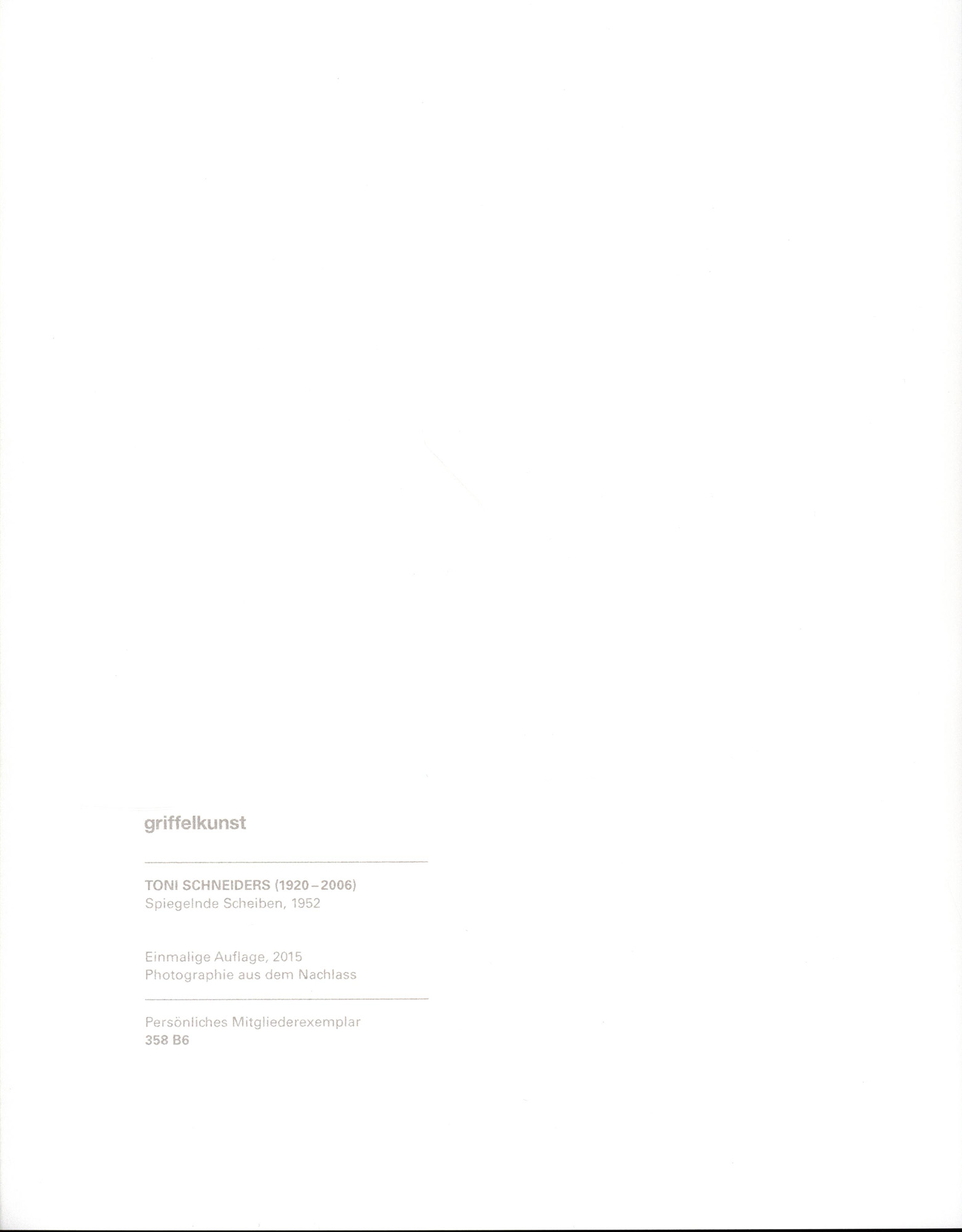 6 Originalfotografien in Schwarz-Weiß auf Bergger Prestige Warmton Barytpapier. Hergestellt aus dem Nachlass durch Larry Lazarus, Hamburg. Rückseitig mit typografischer Beschriftung versehen. Fotografien in Originalmappe mit Leporello mit Text von Sebastian Lux. Einmalige Auflage für die Griffelkunst-Vereinigung Hamburg, 2015, Verzeichnis der Editionen 358 B1-B6. Maße Blätter: 30,5 x 24,0 cm. Maße Abbildungen: 25,5 x 20,0 cm. Sehr gutes, tadelloses Exemplar.