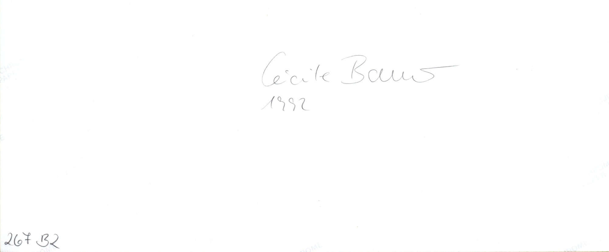 Original color photograph, photo work on Fujicolor Professional Paper. Signed and dated (1992) in lead on the verso by Cecile Bauer. Edition of the Griffelkunst Association, Hamburg, 1992. Griffelkunst, Catalogue of Editions 267 B2. Sheet dimensions: 40.5 x 30.5 cm. Image dimensions: 37.5 x 27.5 cm. Very good, flawless copy.