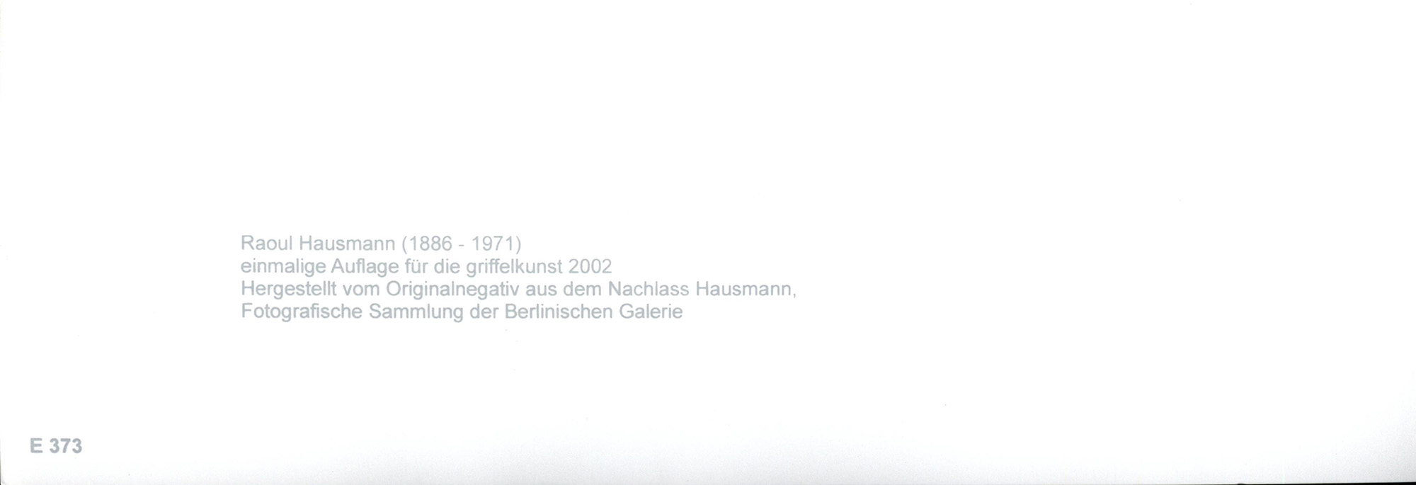 Originalfotografie in Schwarz-Weiß. Silbergelatineabzug hergestellt vom Originalnegativ aus dem Nachlass raoul Hausmann, Fotografische Sammlung der Berlinischen Galerie. Edition der Griffelkunst Hamburg, 2002. Griffelkunst Verzeichnis der Editionen E 373. Maße: 40,4 x 30,5 cm. Maße Abbildung: 29,6 x 20,5 cm. Sehr guter, tadelloser Zustand.