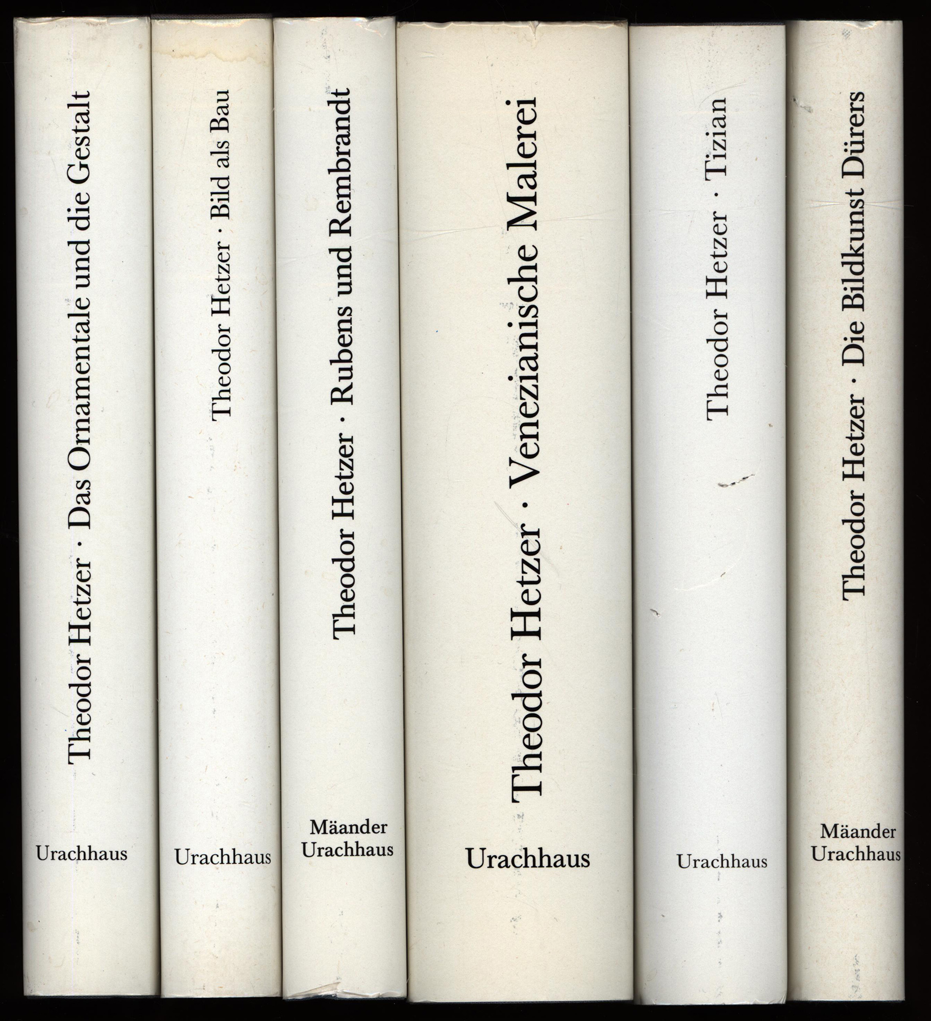 Hetzer, Theodor und Berthold, Gertrude [Hrsg.]: Schriften Theodor Hetzers. (Konvolut aus 6 Bänden). Band 2: Die Bildkunst Dürers. Band 3: Das Ornamentale und die Gestalt. Band 4: Bild als Bau. Band 5: Rubens und Rembrandt. Band 7: Tizian. Band 8: Venezianische Malerei. 6 Bände (von 9). Mittenwald und Stuttgart, Mäander Kunstverlag und Verlag Urachhaus, 1982 -1985. Groß-8°. 24 x 17,5 cm. 346, 435, 384, 399, 494 und 791 Seiten. Original-Leinenbände mit Original-Schutzumschägen.