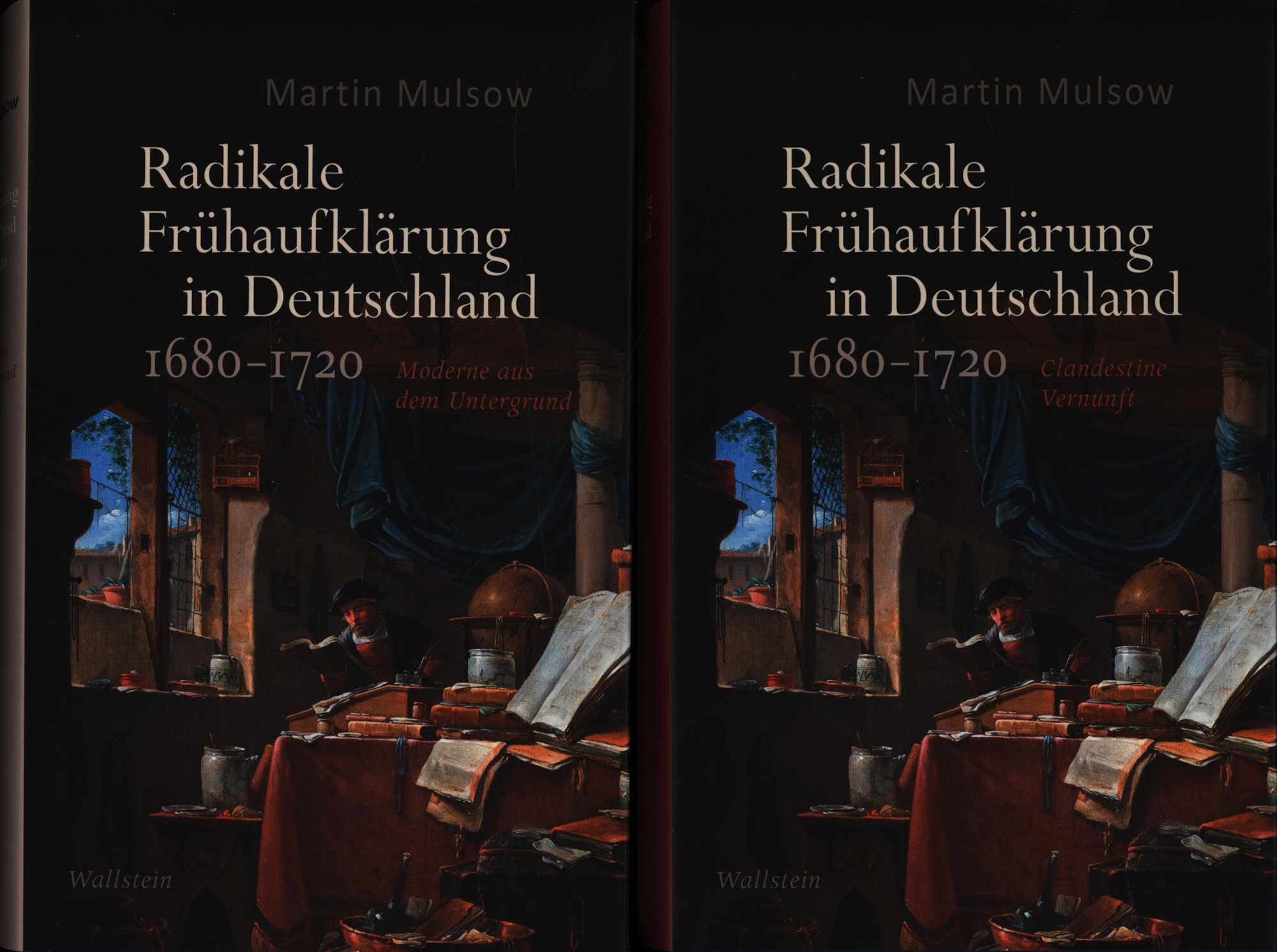Mulsow, Martin: Radikale Frühaufklärung in Deutschland 1680–1720. Band 1: Moderne aus dem Untergrund. Band 2: Clandestine Vernunft. 2 Bände (komplett). Göttingen, Wallstein Verlag, 2018. Groß-8°. 23 x 15 cm. 502 und 624 Seiten. Original-Pappbände mit Original-Schutzumschlägen im einfachen Pappschuber.