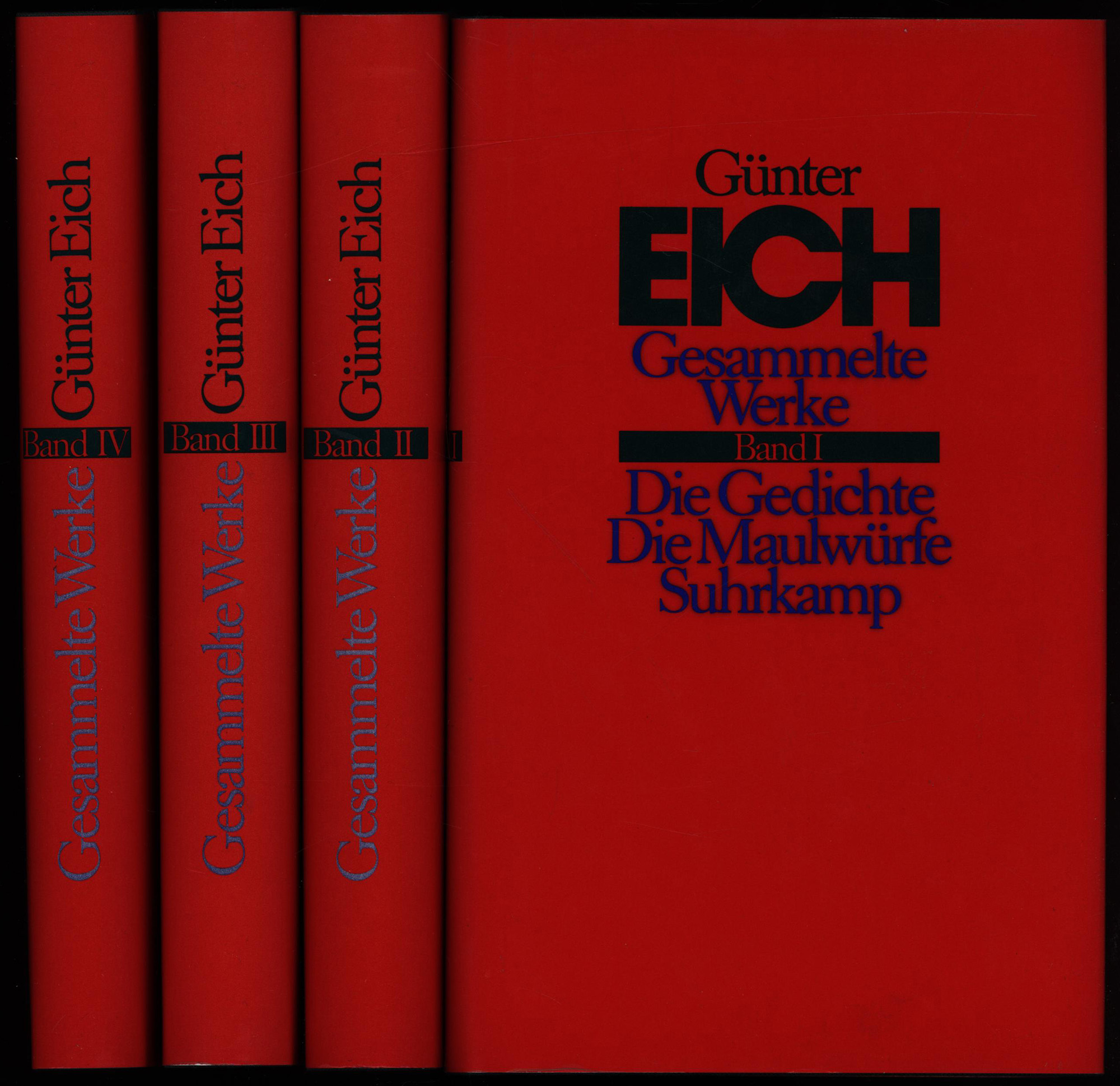 Eich, Günter: Gesammelte Werke in vier Bänden. 4 Bände (komplett). Band I: Die Gedichte. Die Maulwürfe. Band II: Die Hörspiele 1. Band III: Die Hörspiele 2. Band IV: Vermischte Schriften. Frankfurt am Main, Suhrkamp Verlag, 1991. 8°. 21 x 13 cm. 621, 823, 785 und 681 Seiten. Original-Leinenbände mit Original-Schutzumschlägen. Dünndruckausgabe.