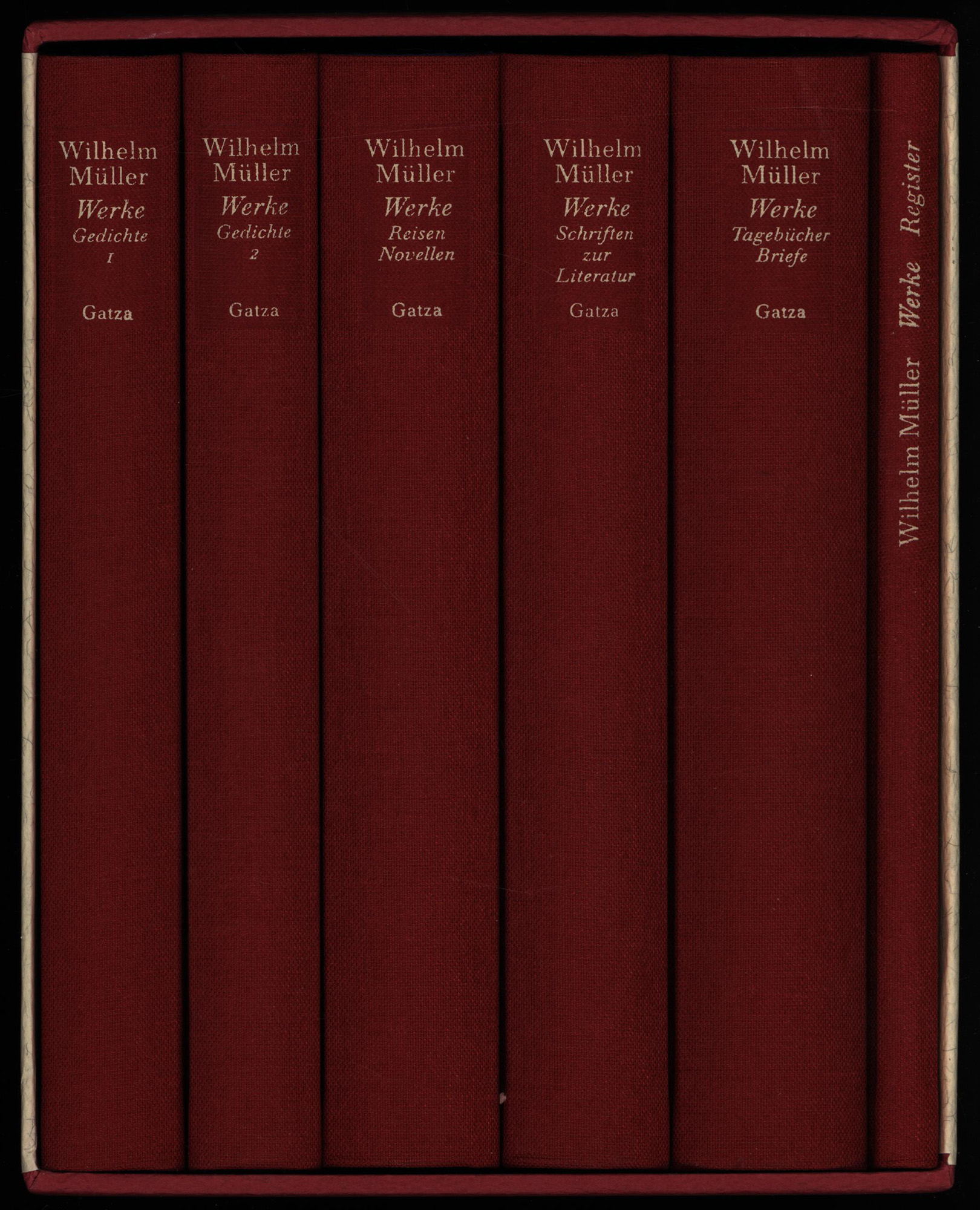 Müller, Wilhelm: Werke, Tagebücher, Briefe. Band 1: Gedichte I. Band 2: Gedichte II. Band 3: Reisebeschreibungen, Novellen. Band 4: Schriften zur Literatur. Band 5: Tagebücher Briefe. Band 6: Register. Herausgegeben von Maria-Verena Leistner. Mit einer Einleitunng von Bernd Leistner. 5 Bände + Register in 6 Bänden (komplett). Berlin, Gatza, 1994. 8°. 20 x 13 cm. 337, 374, 543, 495, 592, 129 Seiten. Original-Halbleinenbände im Original-Pappschuber.