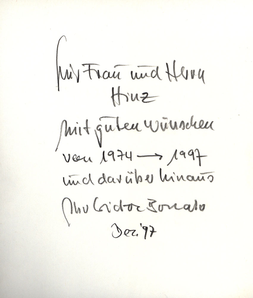 1. Auflage. Mit signierter Widmung von Victor Bonato mit Bleistift auf voderem Innendeckel, datiert Dez. ’97. Beiliegend eine Ausstellungseinladung. Mit zahlreichen Schwarz-Weiß-Abbildungen. Buchrücken leicht gedunkelt und Laminierung mit einer kleinen Fehlstelle, ansonsten sehr gutes Exemplar.