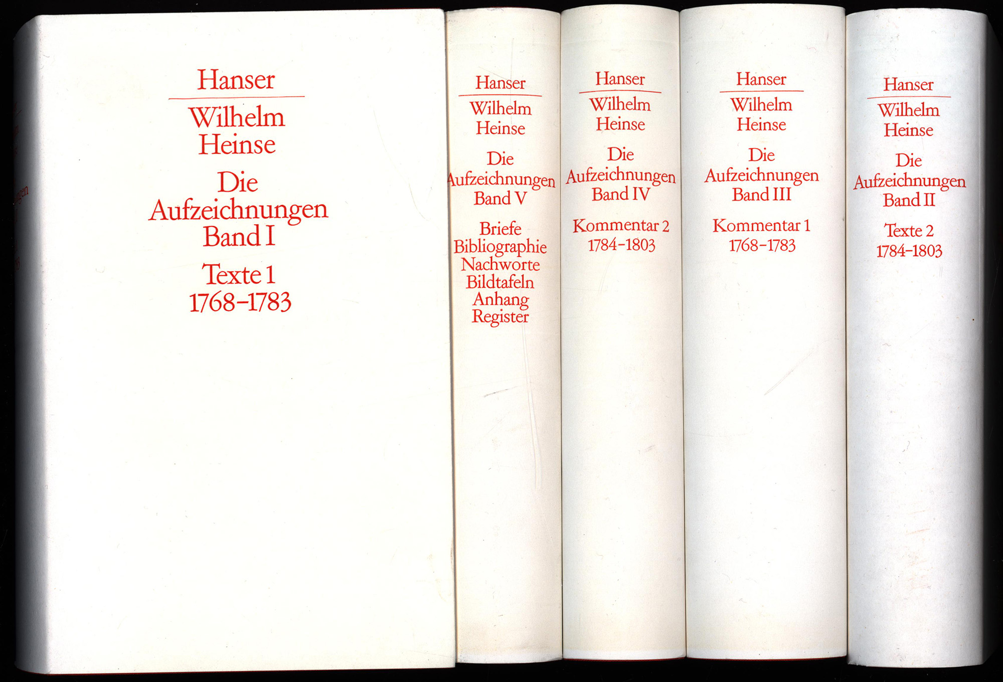 Heinse, Wilhelm; Bernauer, Markus [Hrsg.]: Die Aufzeichnungen – Frankfurter Nachlass. Band 1: Texte 1768-1783. Band 2: Texte 1784-1803. Band 3: Kommentar zu Band I 1768-1783. Band 4: Kommentar zu Band II 1784-1803. Band 5: Verstreute Texte und Briefe, Bibliographie, Nachworte, Bildtafeln, Anhang, Register. Herausgegeben von Markus Bernauer. 5 Bände. München und Wien, Carl Hanser Verlag, 2003-2005. 8°. 19 x 12 cm. 1408, 1488, 1679, 1255, 923 Seiten. Original-Leinenbände mit Original-Schutzumschlägen. Dünndruckausgabe.