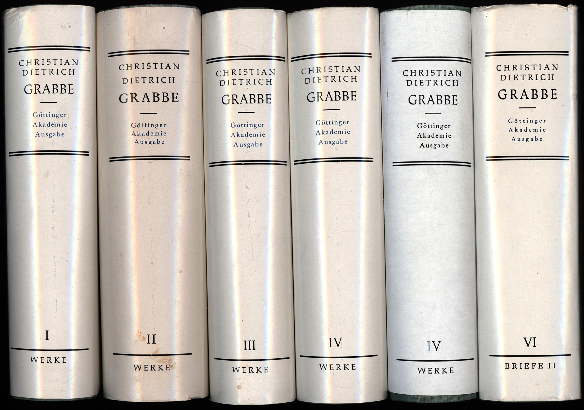 Grabbe, Christian Dietrich: Christian Dietrich Grabbe. Werke und Briefe. Göttinger Akademie-Ausgabe. Historisch-kritische Gesamtausgabe in sechs Bänden. Herausgegeben von der Akademie der Wissenschaften in Göttingen. Bearbeitet von Alfred Bergmann. Band 1-4 Werke. Band 5 Briefe I. Band 6 Briefe II. 6 Bände (komplett). Emsdetten (Westf.), Verlag Lechte, 1960-1973. 8°. 22 x 15 cm. XV, 676, 805, 671, XIII, 672, XIV, 669, 840 Seiten. Original-Leinenbände mit Original-Schutzumschlägen und goldgeprägten Deckel- und Rückentiteln. Graue Kopfschnitte.