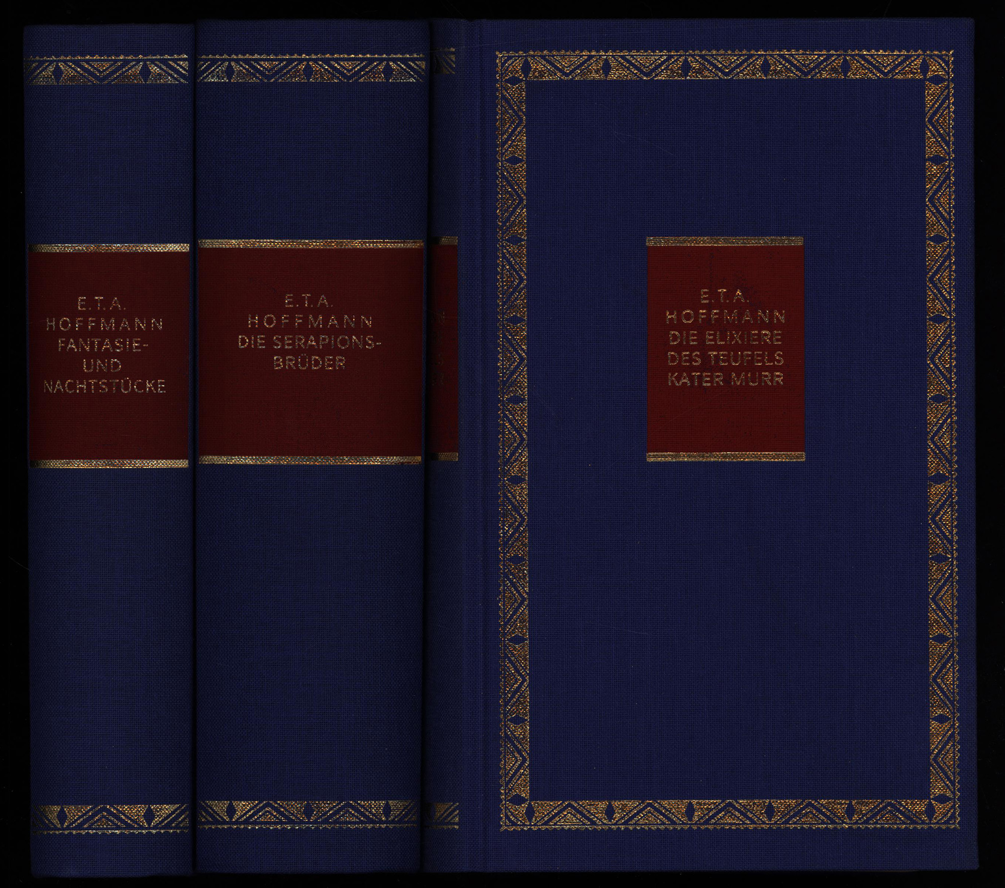 Hoffmann, E.T.A.: Die Serapions-Brüder. Band 2: Fantasie und Nachtstücke. Band 3: Die Elixiere des Teufels. Lebens-Ansichten des Katers Murr. Einmalige Sonderausgabe. 3 Bände. München, Artemis & Winkler, 1993. 8°. 19,5 x 13 cm. 1154 (2), 820 (2), 734 (1) Seiten. Original-Leinenbände mit goldgeprägten Deckel- und Rückentiteln.