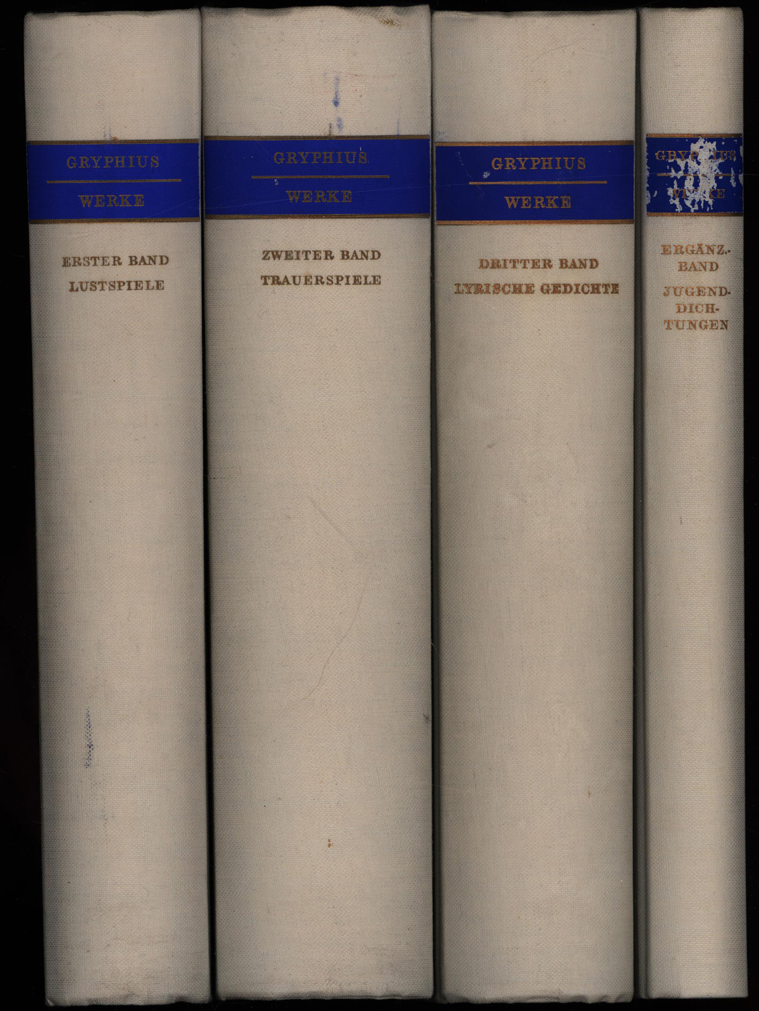 Gryphius, Andreas: Werke in drei Bänden mit Ergänzungsband. Herausgegeben von Hermann Palm. Band 1: Lustspiele. Band 2: Trauerspiele. Band 3: Lyrische Gedichte. Band 4: Ergänzungsband. Lateinische und Deutsche Jugenddichtungen. Ergänzungsband mit einem textlichen Nachtrag und einer Bibliographie der Gryphius-Drucke. Herausgegeben von Friedrich-Wilhelm Wentzlaff-Eggebert. 4 Bände (komplett). Darmstadt, Wissenschaftliche Buchgesellschaft, 1961. 8°. 22,5 x 14,5 cm. XXV, 580, 813, 692, XXXIX, 273 Seiten. Original-Leinenbände mit goldgeprägten Rückentiteln.