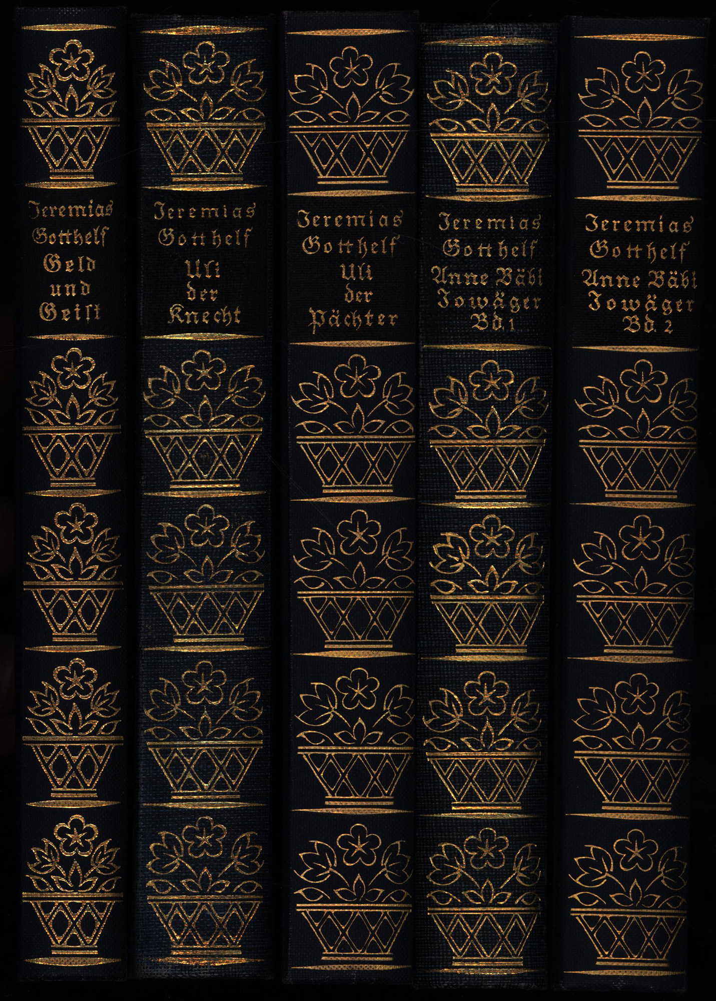 Gotthelf, Jeremias: Konvolut von 5 Bänden. Band 1: Geld und Geist oder Die Versöhnung. Band 2: Wie Uli der Knecht glücklich wird. Eine Gabe für Dienstboten und Meisterleute. Band 3: Uli der Pächter. Band 4: Wie Anne Bäbi Jowäger haushaltet und wie es ihm mit dem Dottern geht. Erster Teil. Band 5: Wie Anne Bäbi Jowäger haushaltet und wie es ihm mit dem Dottern geht. Zweiter Teil. 5 Bände. Erlenbach-Zürich, München und Leipzig, Eugen Rentsch Verlag, o.J. 8°. 21,5 x 14,5 cm. 397, 390, 448, 418, 434 Seiten. Original-Leinenbände mit goldgeprägten Rückentiteln und braunen Farbschnitten.