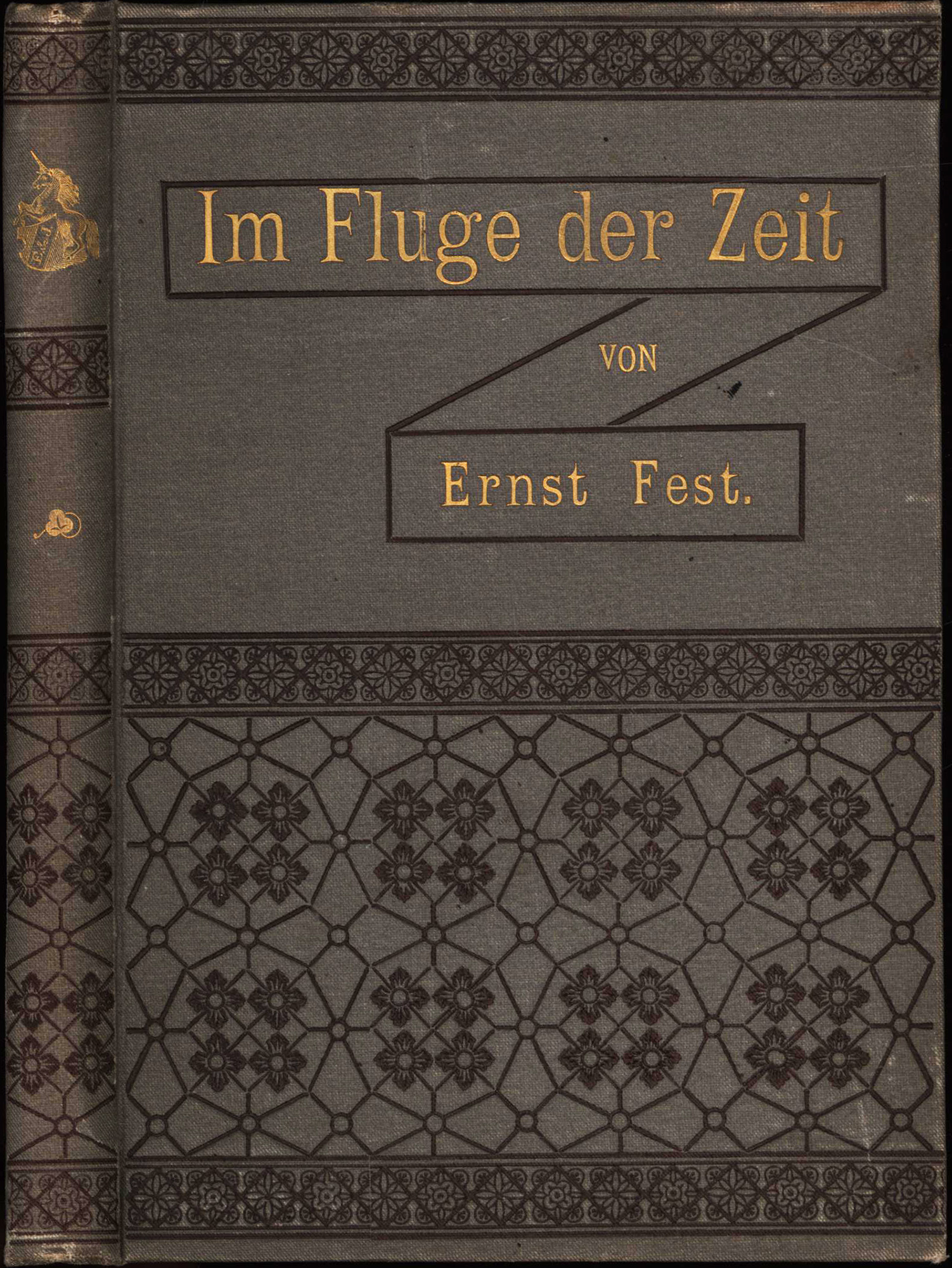 Fest, Ernst: Im Fluge der Zeit. Dichtungen. Leipzig, Eduard Heinrich Mayer, 1887. Klein-8°. 18 x 13 cm. VIII, 166 Seiten. Leinenband der Zeit mit goldgeprägtem Deckel- und Rückentitel und Rundum-Goldschnitt.