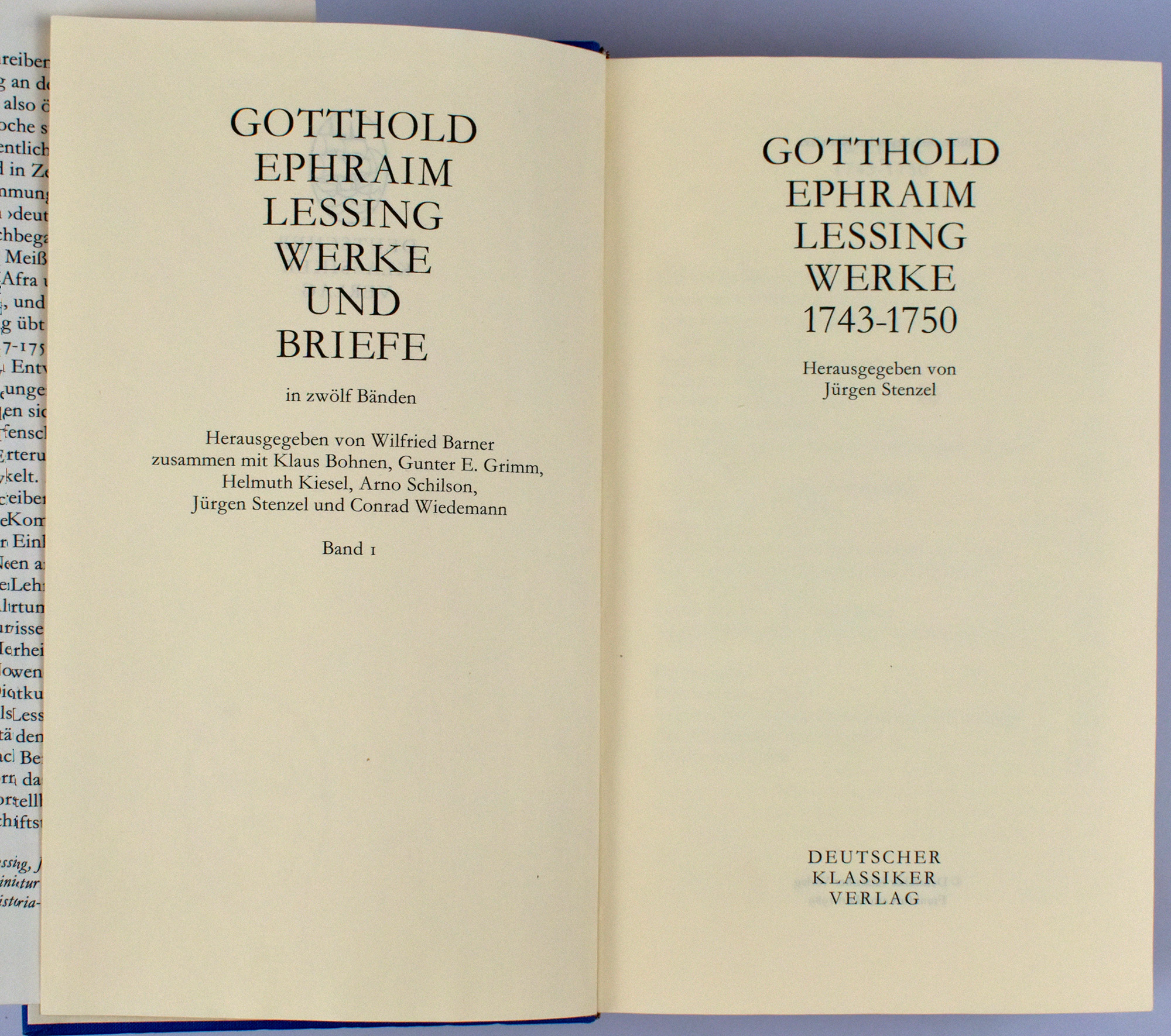 Lessing, Gotthold Ephraim: Werke und Briefe in zwölf Bänden. Herausgegeben von Wilfried Barner zusammen mit Klaus Bohnen, Gunter E. Grimm, Helmuth Kiesel, Arno Schilson, Jürgen Stenzel und Conrad Wiedemann. 12 Bände (in 14, komplett). Frankfurt am Main, Deutscher Klassiker Verlag, 1985-2003. Klein-8°. 18 x 11 cm. zus. 17000 Seiten. Blaue Original-Leinenbände mit Original-Halbumschlägen und Original-Klarsichtumschlägen. Goldgeprägte Rückentitel. Dünndruckausgabe auf Persia Dünndruckpapier. (= Bibliothek deutscher Klassiker. Band 6, 17, 36, 45, 47, 53, 57, 94, 117, 148, 149, 172, 176, 184).