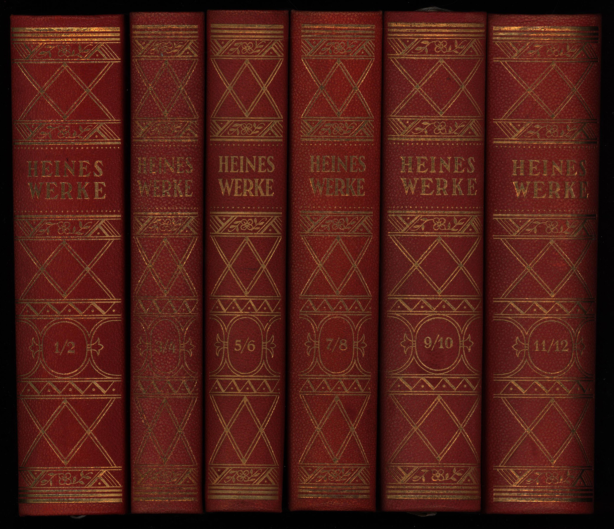 Heine, Heinrich: Heines Werke. Band 1: Buch der Lieder. Neue Gedichte. Band 2: Romanzero. Gedichte 1853-54. Nachlese. Band 3: Atta Troll. Deutschland. Almansor. William Ratcliff. Band 4: Der Rabbi von Bacherach. Aus den Memoiren des Herren von Schnabelewopski. Florentinische Nächte. Band 5/6: Reisebilder I bis III. Band 7: Die romantische Schule. Zur Geschichte der Religion und Philosophie in Deutschland. Band 8: Elementargeister. Die Götter im Exil. Die Göttin Diana. Der Doktor Faust. Shakespeares Mädchen und Frauen. Band 9: Französische Maler, französische Zustände. Über die französische Bühne. Band 10: Lutezia. Band 11: Ludwig Börne. Ludwig Marcus. Geständnisse. Memoiren. Band 12: Kulturbilder. Kleine Schriften. Biographie und Gesamtwürdigung. 12 Bände (in 6, komplett). Berlin, Volksverband der Bücherfreunde und Wegweiser-Verlag, 1928-1930. 8°. 19,5 x 13,5 cm. 320, 476, 306, 187, 350, 335, 296, 373, 351, 322, 571 Seiten. Original-Halblederbände mit goldgeprägten Rückentiteln und roten Kopfschnitten.