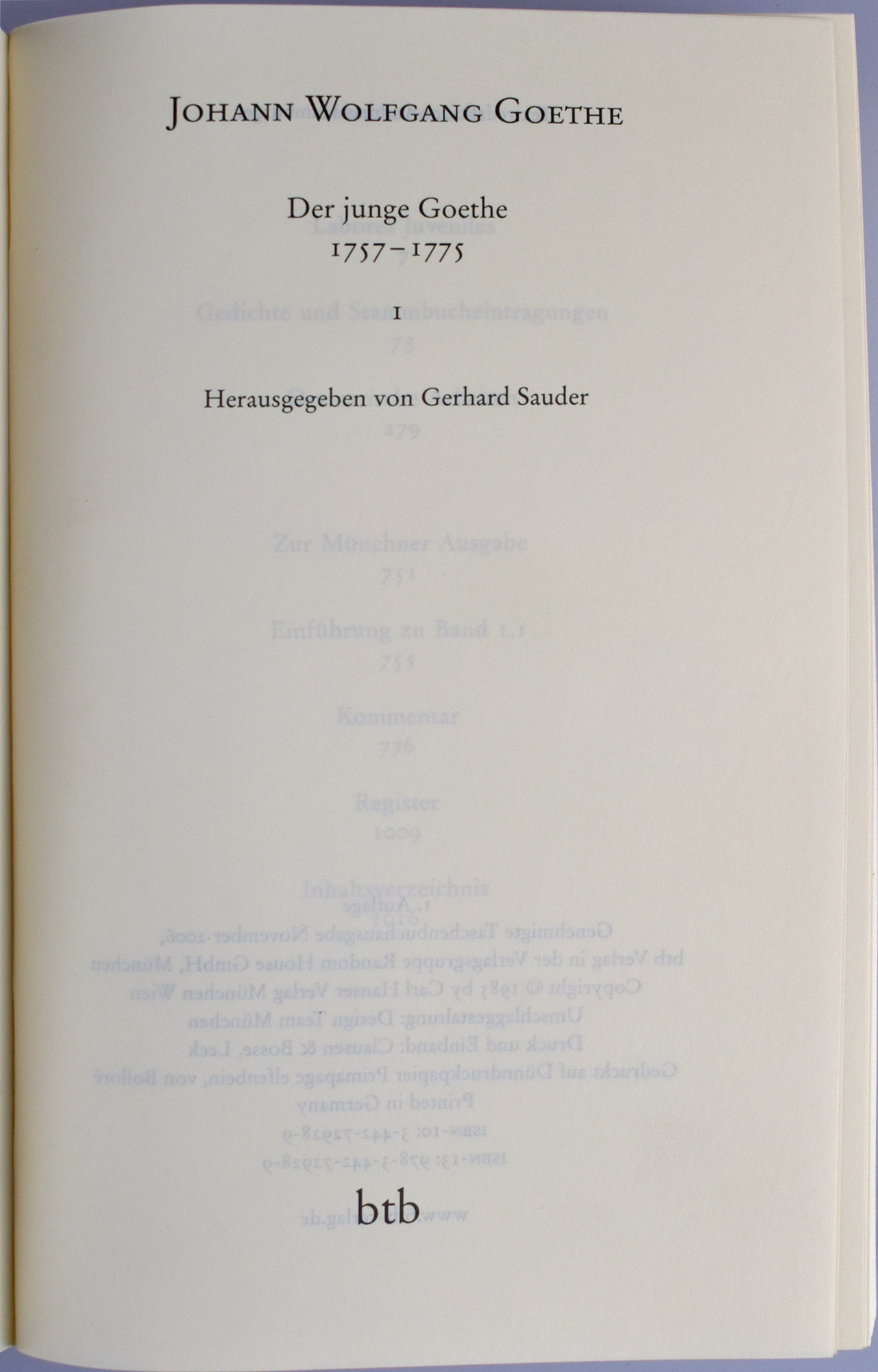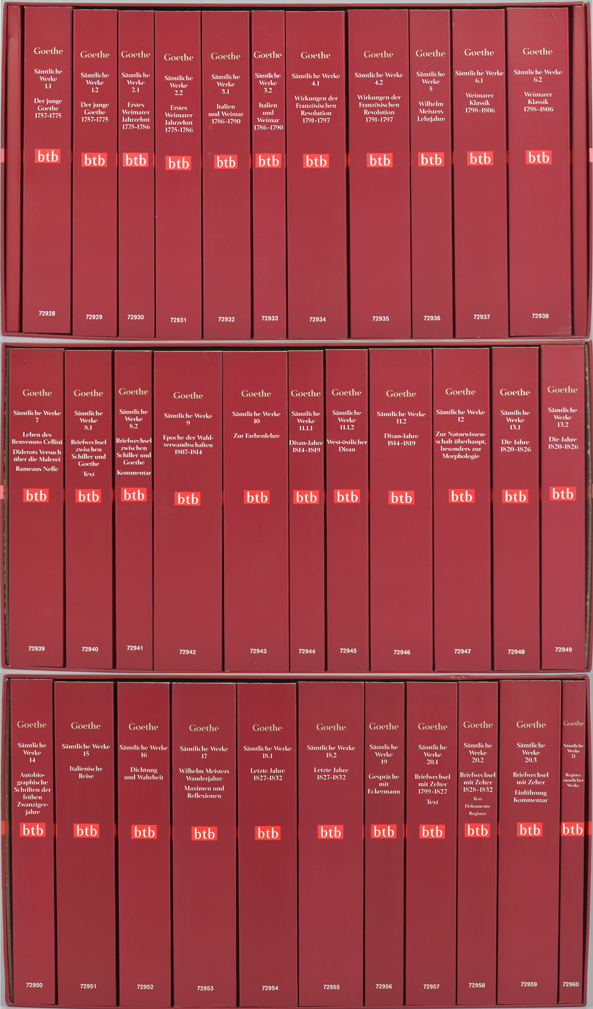 Goethe, Johann Wolfgang; Sprengel, Peter [Hrsg.]: Johann Wolfgang von Goethe. Sämtliche Werke nach Epochen seines Schaffens. Münchner Ausgabe. Herausgegeben von Karl Richter in Zusammenarbeit mit Herbert G. Göpfert, Norbert Miller und Gerhard Sauder. München, btb, 2006. 8°. 19 x 12 cm. Ca. 35000 Seiten. Original-Kartonbände in 3 Original-Pappschubern. Dünndruckausgabe. (= btb. Bände 72928-72960).