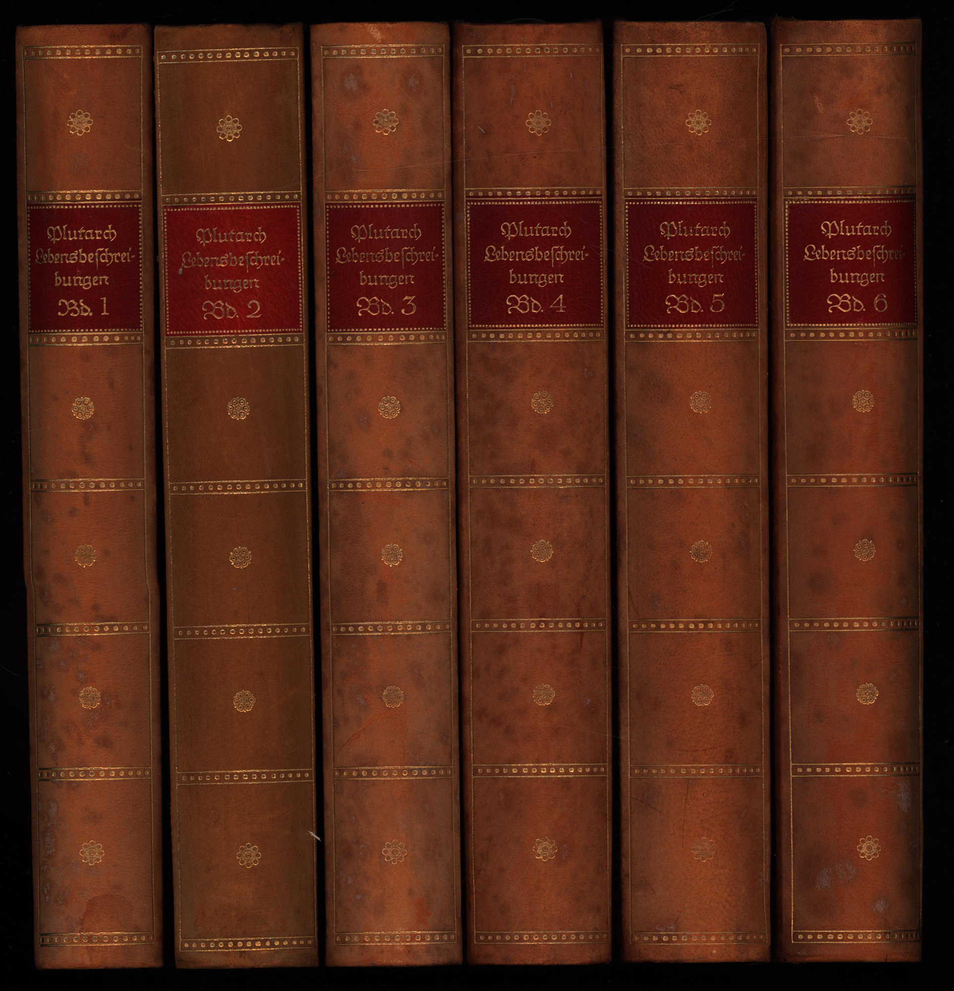 Plutarch; Floerke, Hanns [Hrsg.]: Plutarch. Lebensbeschreibungen. Mit Anmerkungen nach der Übersetzung von Kaltwasser bearbeitet von Hanns Floerke. 6 Bände (komplett). München und Leipzig, Georg Müller Verlag, 1913. 8°. 22 x 14 cm. Ca. 2600 Seiten. Original-Halblederbände mit goldgeprägten Rückentiteln und roten Farbschnitten. (= Klassiker des Altertums. Zweite Reihe. Ausgewählt und herausgegeben von Hanns Floerke. Band 1-6).