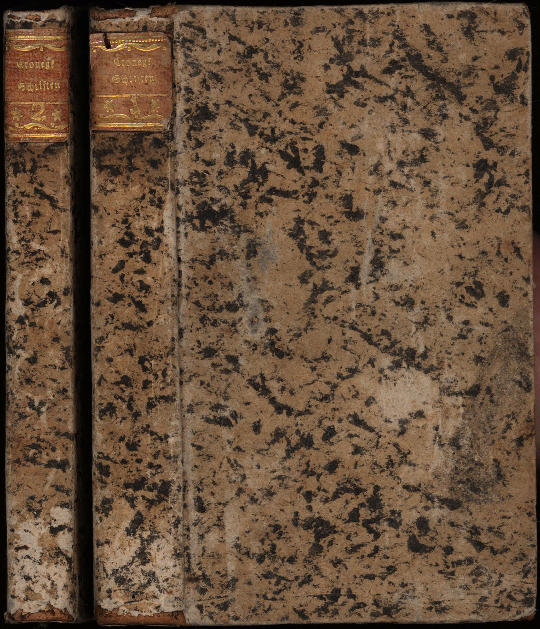 Cronegk, Johann Friedrich von: Des Freyherrn Johann Friederich von Cronegk sämtliche Schriften. Mit allerhöchst-gnädigst Kayserlichem Privilegio. 2 Bände. Carlsruhe, bey Christian Gottlieb Schmieder, 1776. Klein-8°. 17,5 x 11 cm. 11 Blatt, 414 und 2 Blatt, 330 Seiten. Halblederbände der Zeit in Papier eingeschlagen, mit goldgeprägten Rückentiteln auf braunen Lederschildchen.