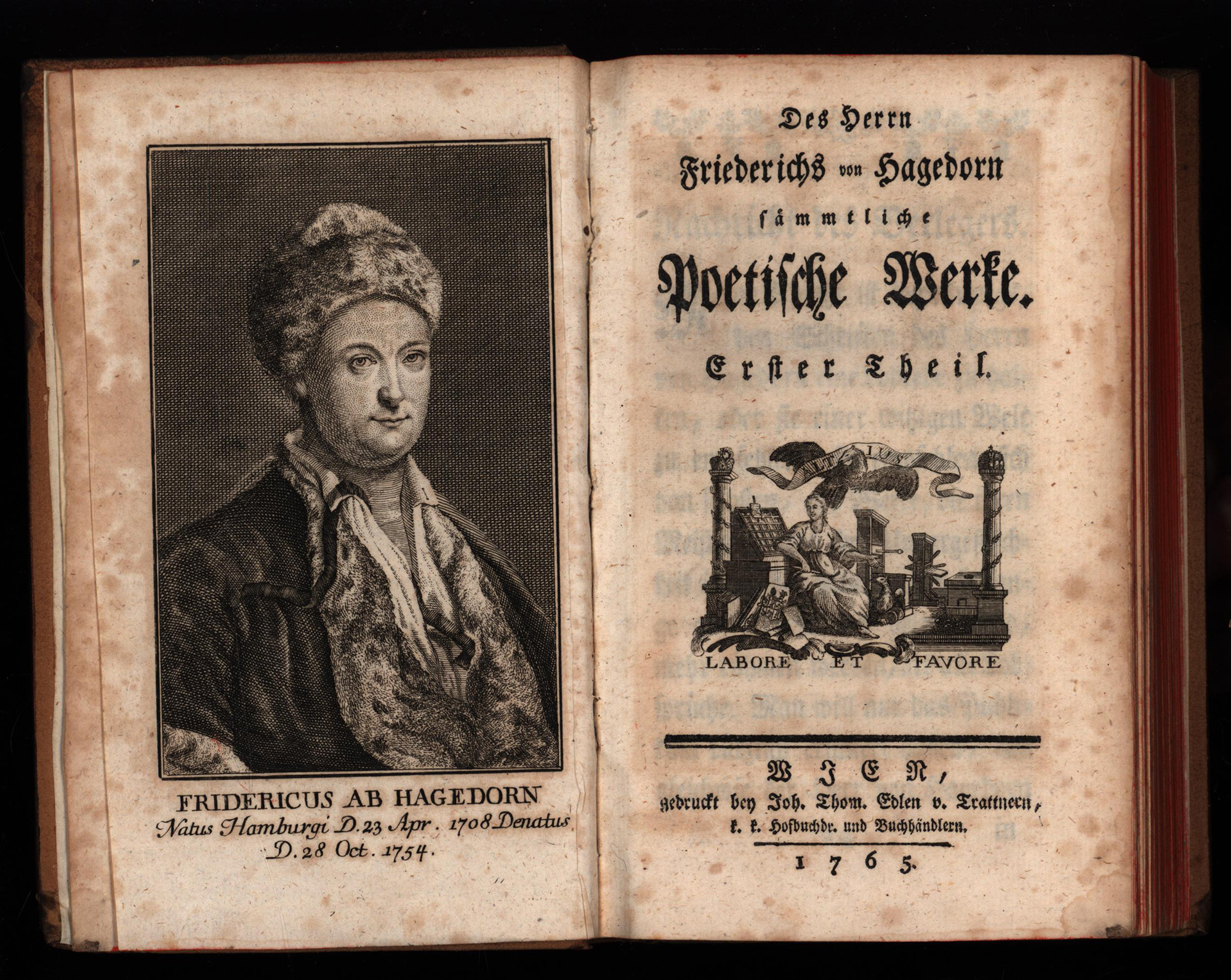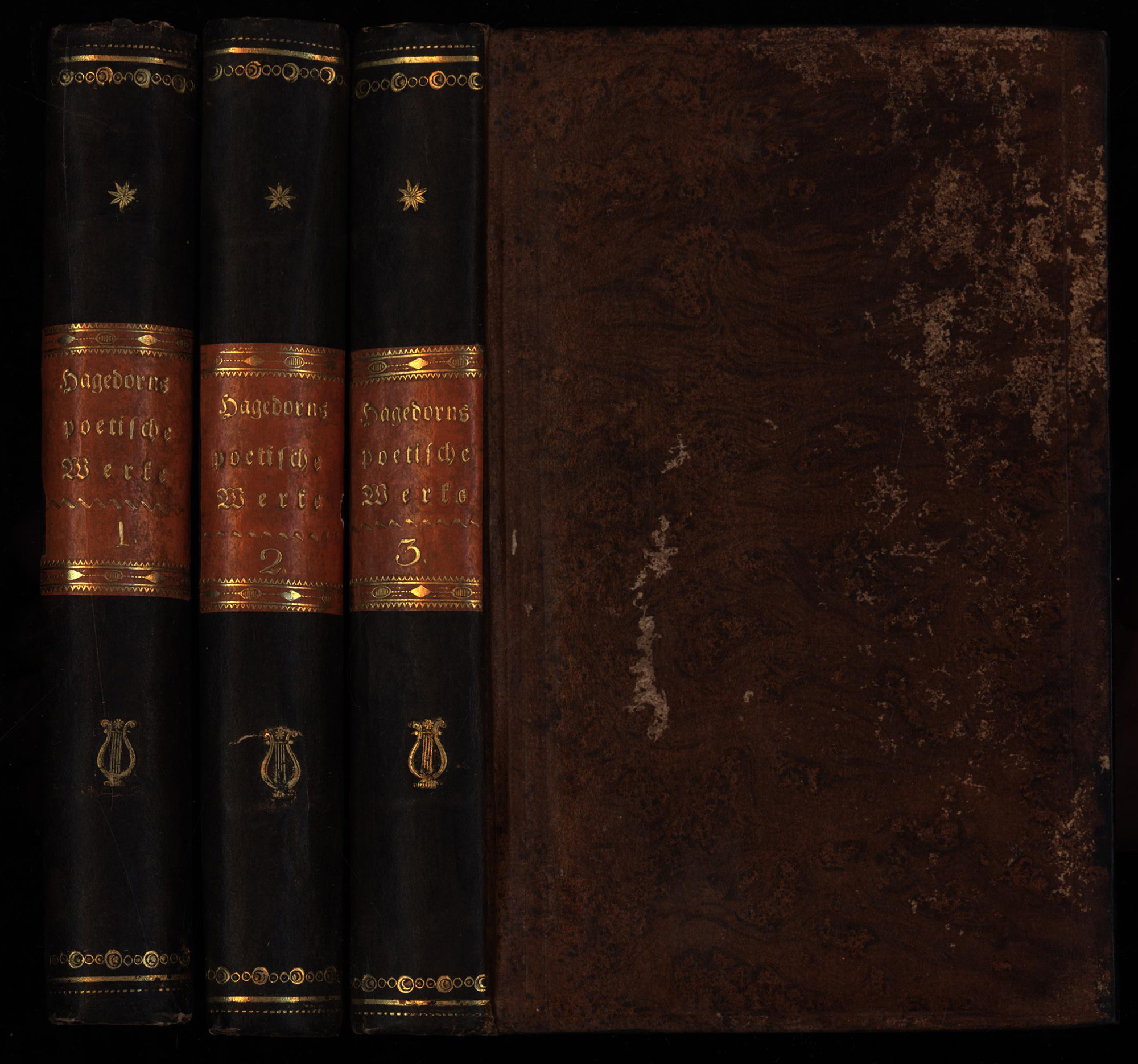 Hagedorn, Friedrich von: Des Herrn Friedrichs von Hagedorn sämmtliche poetische Werke in dreyen Theilen. 3 Bände (komplett). Wien, Johann Thomas Edlen von Trattnern, 1765. Klein-8°. 17 x 11 cm. 22 Blatt, 240 Seiten, 3 Blatt, 315 (3), 292 (4) Seiten. Pappbände der Zeit mit goldgeprägten Rückentiteln und roten Farbschnitten.
