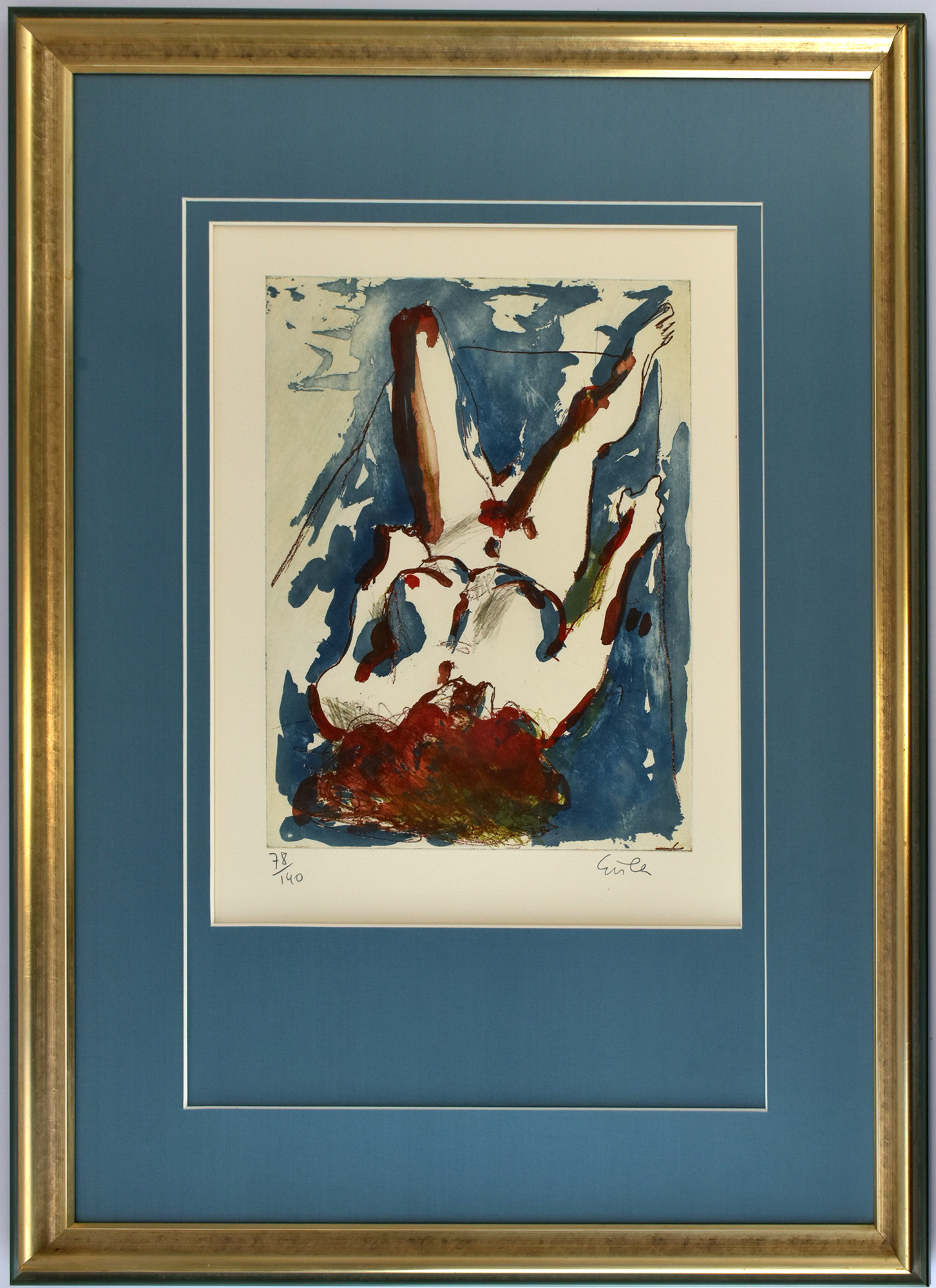 Number 78 of 140 numbered original color etchings on laid paper. Signed in pencil by Georg Eisler below the image. Professionally framed by a gallery behind glass/blue matting, in a partially gilded wooden frame. Not examined out of the frame. Image dimensions: 33.0 x 26.0 cm. Frame dimensions: 72.5 x 55.0 cm. Very good condition.