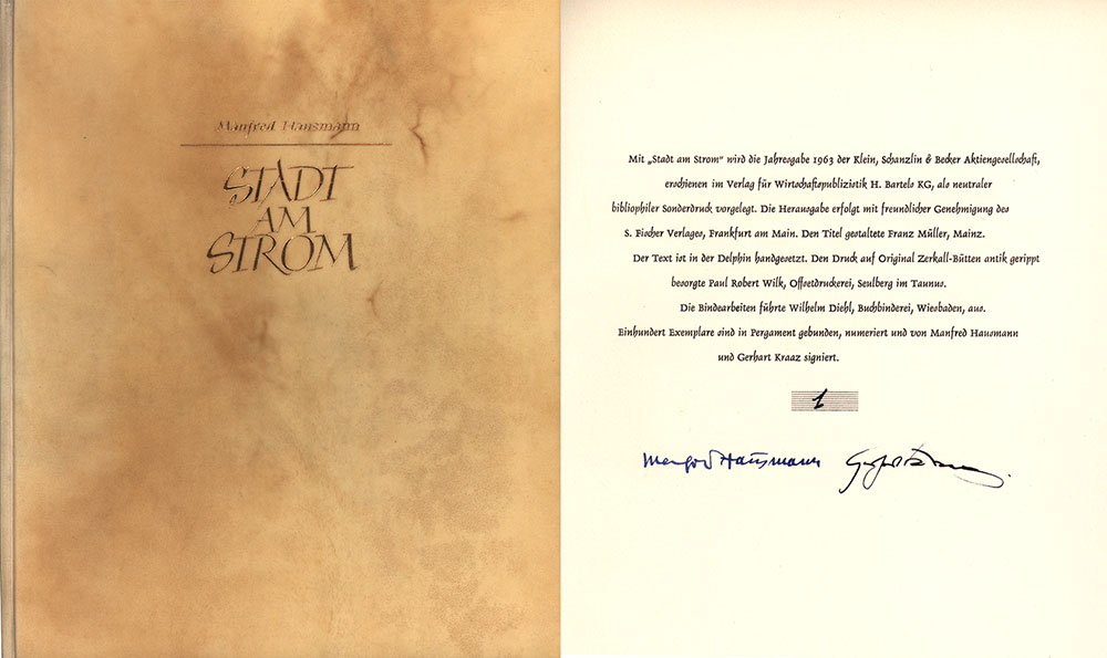 Hausmann, Manfred: Stadt am Strom. [Signierte Vorzugsausgabe]. Wiesbaden, Verlag für Wirtschaftspublizistik H. Bartels, 1963. 4°. 27 x 23 cm. 36 (3) Seiten. Original-Pergamentband mit goldgeprägtem Deckeltitel im Original-Pappschuber.
