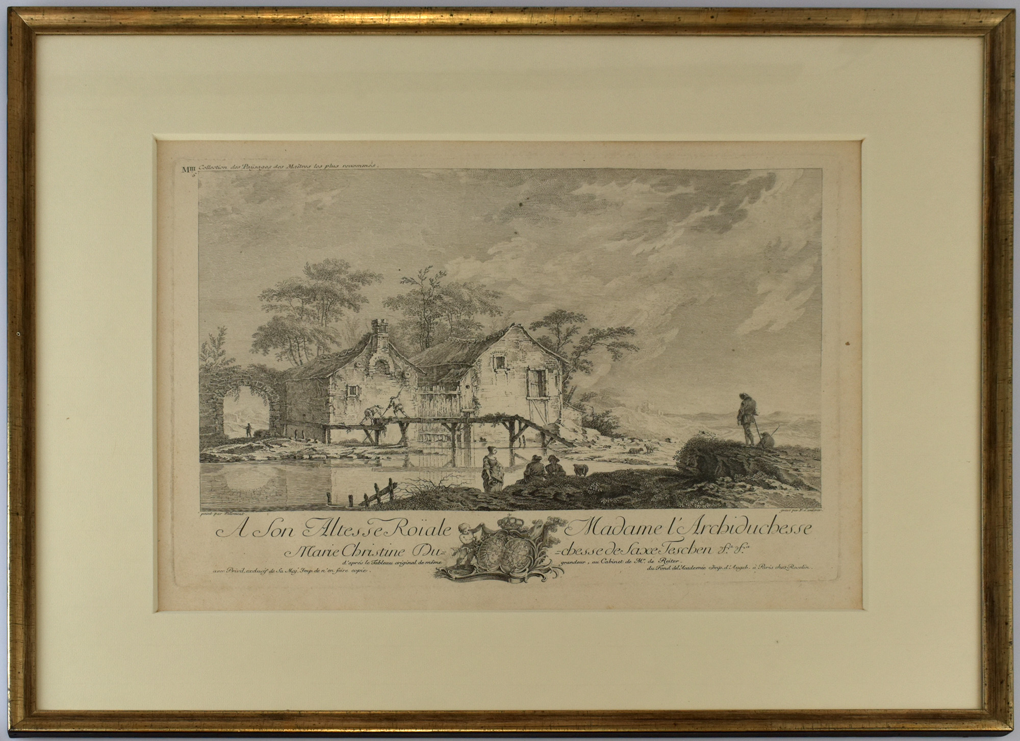 Original copper engraving by Ferdinand Landerer after Victor Pillemant, circa 1790, on laid paper. Below the image is a dedication to Archduchess Maria Christina of Saxony, in French. Professionally mounted by a gallery behind glass/passe-partout in a partially gilded wooden frame. Not examined ot of the frame. Image dimensions: 30.5 x 40.5 cm. Frame dimensions: 50.5 x 59.5 cm. The engraving and passe-partout have minimal foxing. Overall, in very good condition.