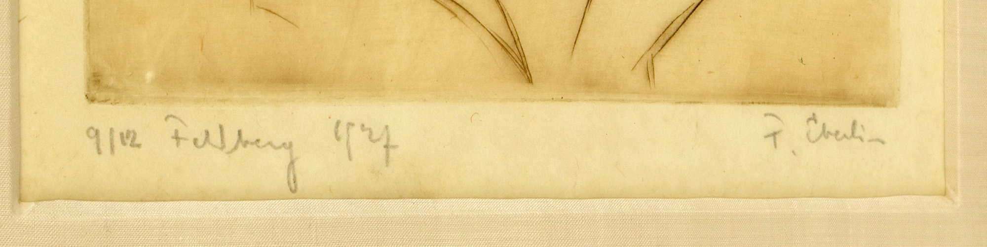 Number 9 of 12 numbered original etchings on Japanese paper. Dated and signed in pencil „Feldberg 1927“ below the image by Franz Eberlin. Professionally framed in an old, antique wooden frame. Not removed from the frame. Image dimensions: 20.0 x 16.0 cm. Frame dimensions: 42.0 x 37.0 cm. Very good condition.