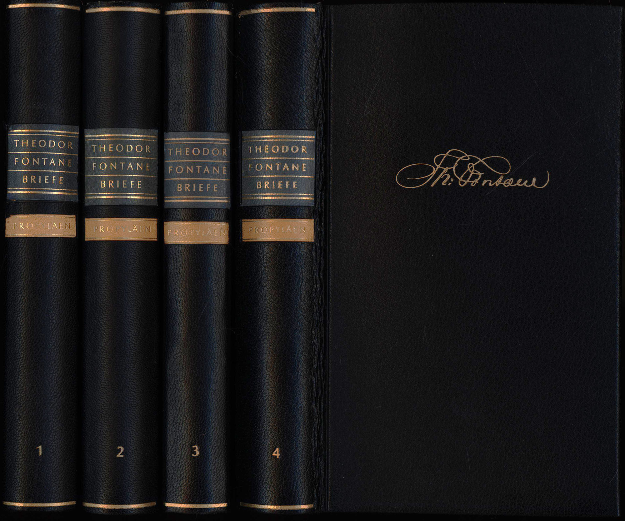 Fontane, Theodor; Schreinert, Kurt [Hrsg.]: Briefe. Herausgegeben von Kurt Schreinert. Zu Ende geführt und mit einem Nachwort versehen von Charlotte Jolles. Erste wort- und buchstabengetreue Edition nach den Handschriften. 4 Bände (komplett). Berlin, Propyläen, 1968-1971. 8°. 20 x 12 cm. 353, 346, 302 und 446 Seiten. Original-Lederbände mit goldgeprägten Rückentiteln auf grünen Schildchen sowie gelben Kopfschnitten.