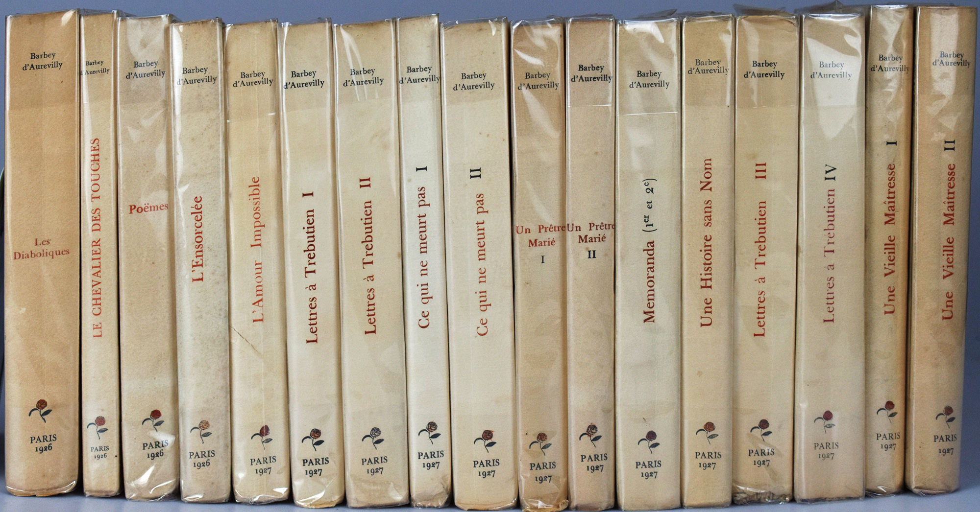 Barbey d’Aurevilly, Jules Amédée: Les oeuvres complètes de Jules Barbey d’Aurevilly. 17 Bände (komplett). Les Diaboliques. / Le Chevalier, des Touches. / Poëmes. Précédés de sa vie et d’une bibliographie par Henri Bachelin. / L’ensorcelée. / L’Amour Impossible. Suivi de Pensées Détachées du Dandysme. / Lettres à Trébutien, inédites. Band I – IV. / Une Vieille Maîtresse. Band I und II. / Ce qui ne Meurt Pas. Band I und II. / Un Prêtre Marié. Band I und II. / Memoranda (1er et 2e). / Une Histoire sans Nom, suivie d’Une Page d’Histoire et de Memoranda (3e et 4e). 17 Bände (komplett). Paris, Bernouard, 1926-1927. 8°. 22 x 15 cm. ca. 5400 Seiten. Schlichte Interimsbände.