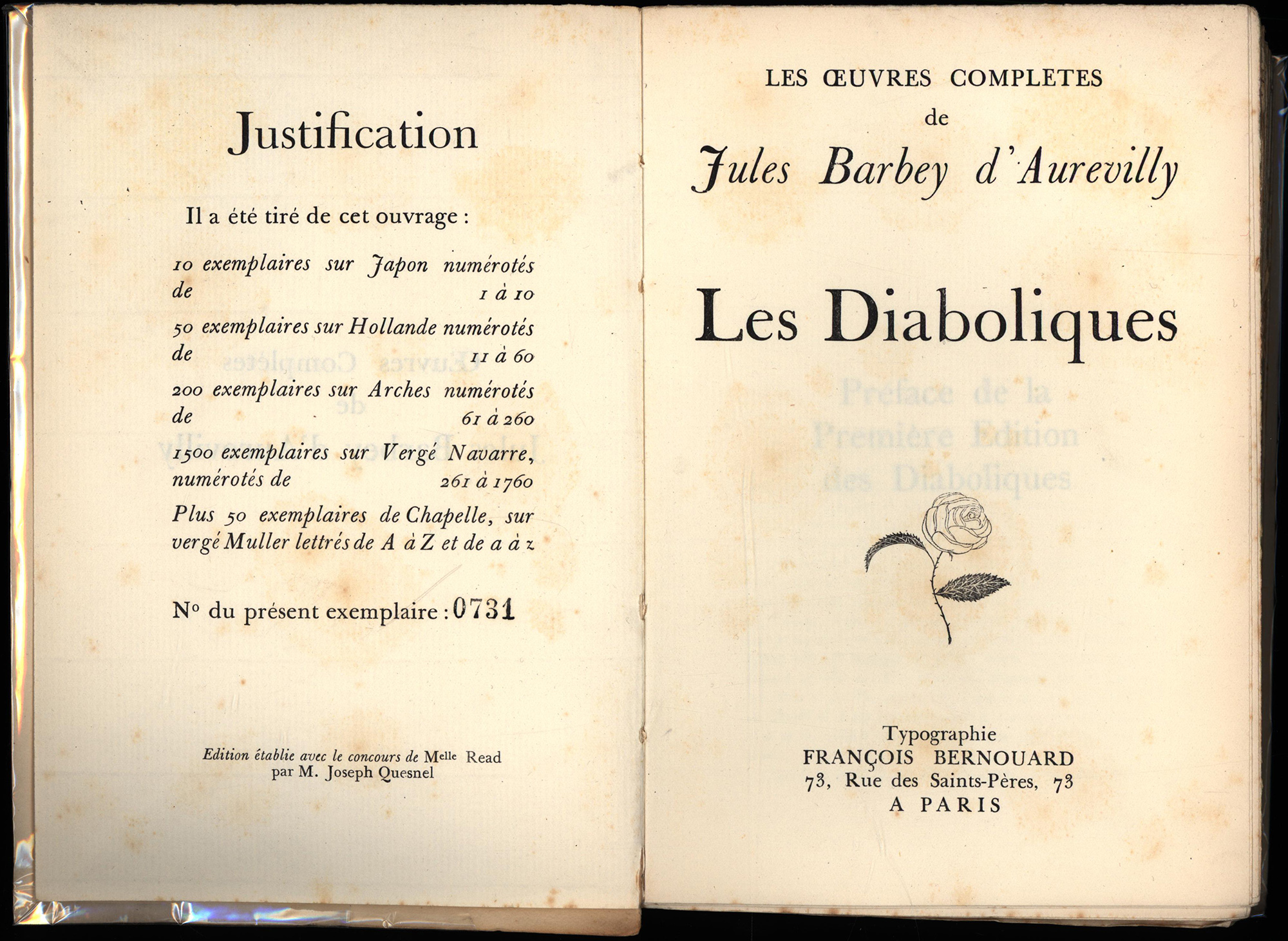 Meist nummerierte von 1500 Exemplare auf Verge Navarre. Französischsprachige Ausgabe. Einbände fleckig, leicht berieben und teils wenig lichtrandig. Schnitte stockfleckig, Ecken und Kanten teils leicht knickspurig. Vortitel mit Stempel, Blätter teils leicht stockfleckig, wenige Blattecken knickspurig. Eine Bindung vom Buchblock gelöst. 6 Bände unaufgeschnitten. Gute Exemplare. Mostly numbered out of 1500 copies by Verge Navarre. French language edition. Plain temporary binding. Cover spotted, slightly rubbed and partly brightened. Edges foxy, corners and book edges partly with slight crease marks. Pretitle with stamps, sheets partly foxy, some sheet corners with slight crease marks. One binding loosened. 6 copies untrimmed. Good copies.