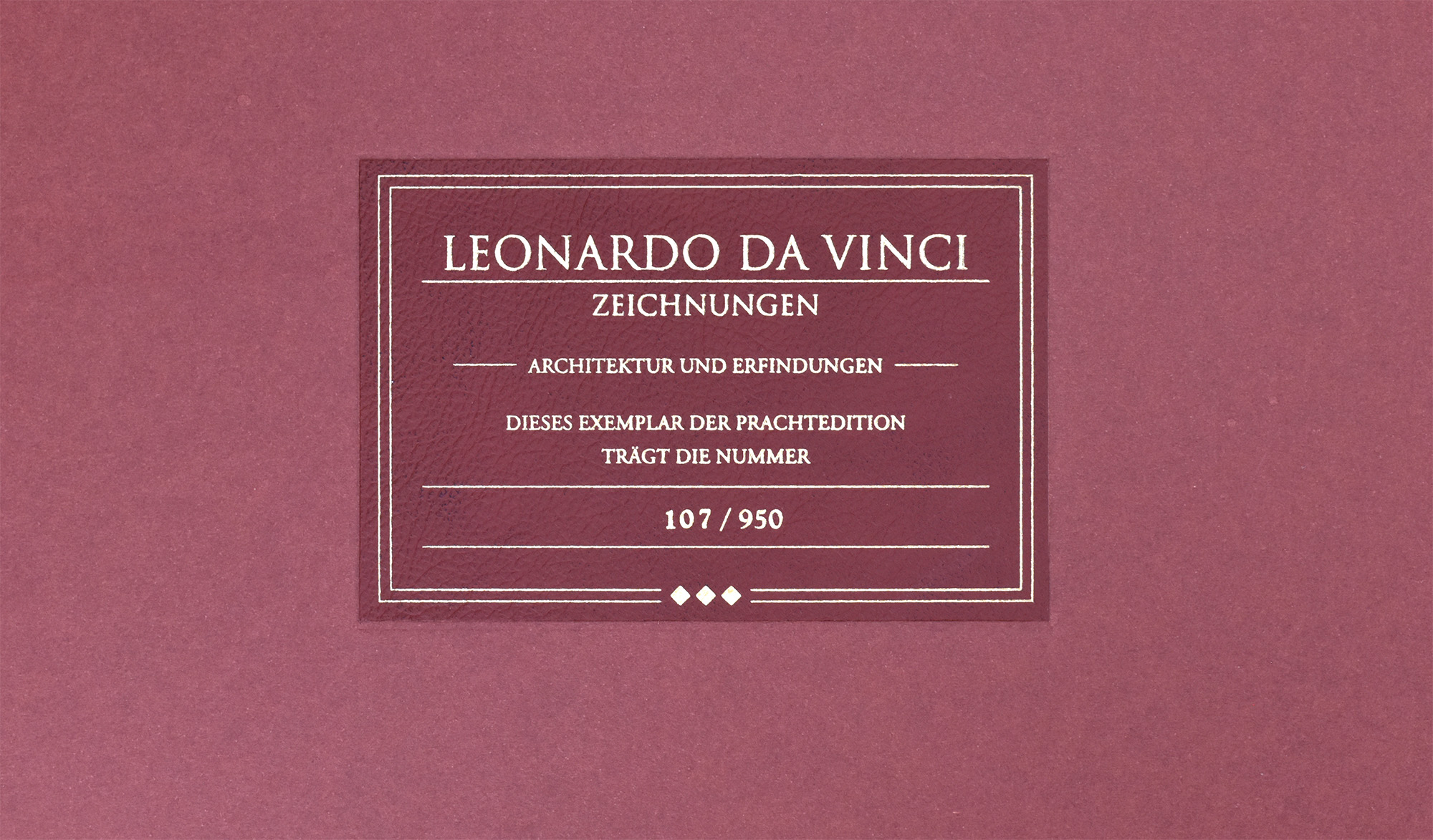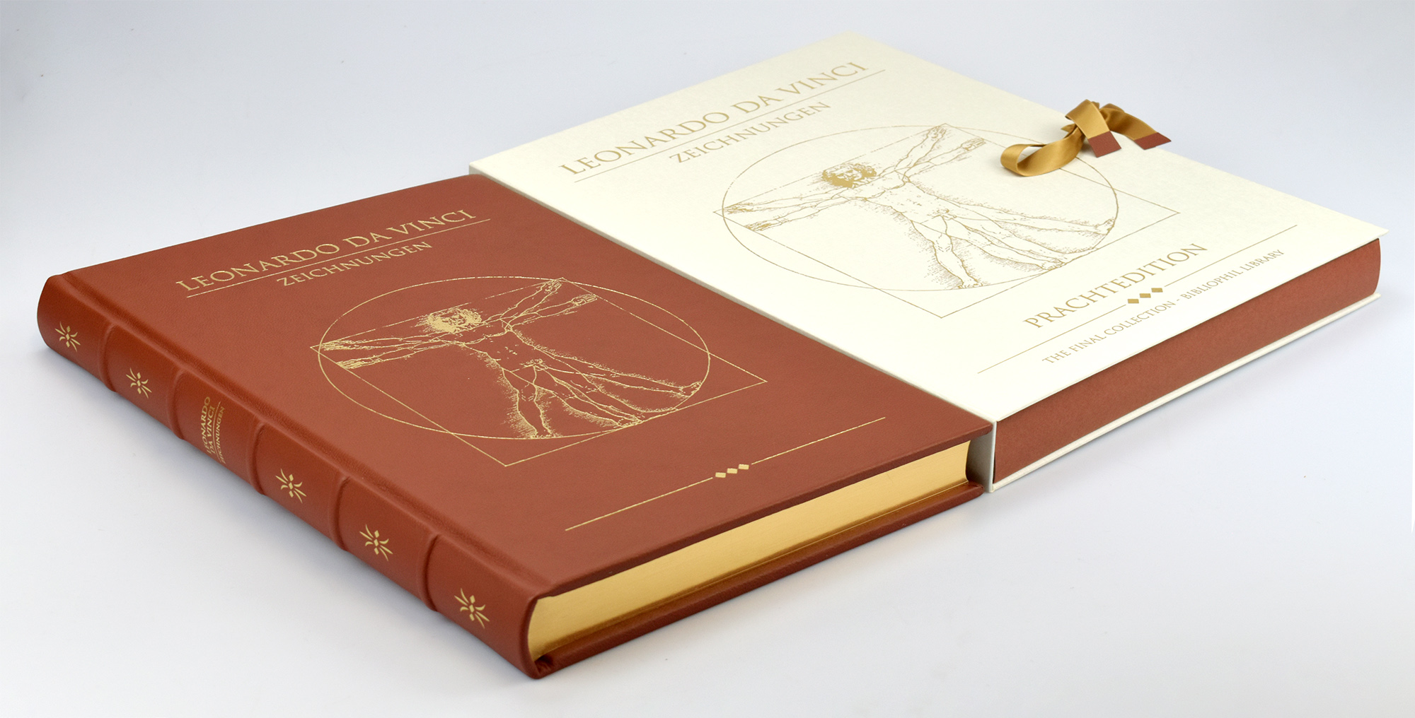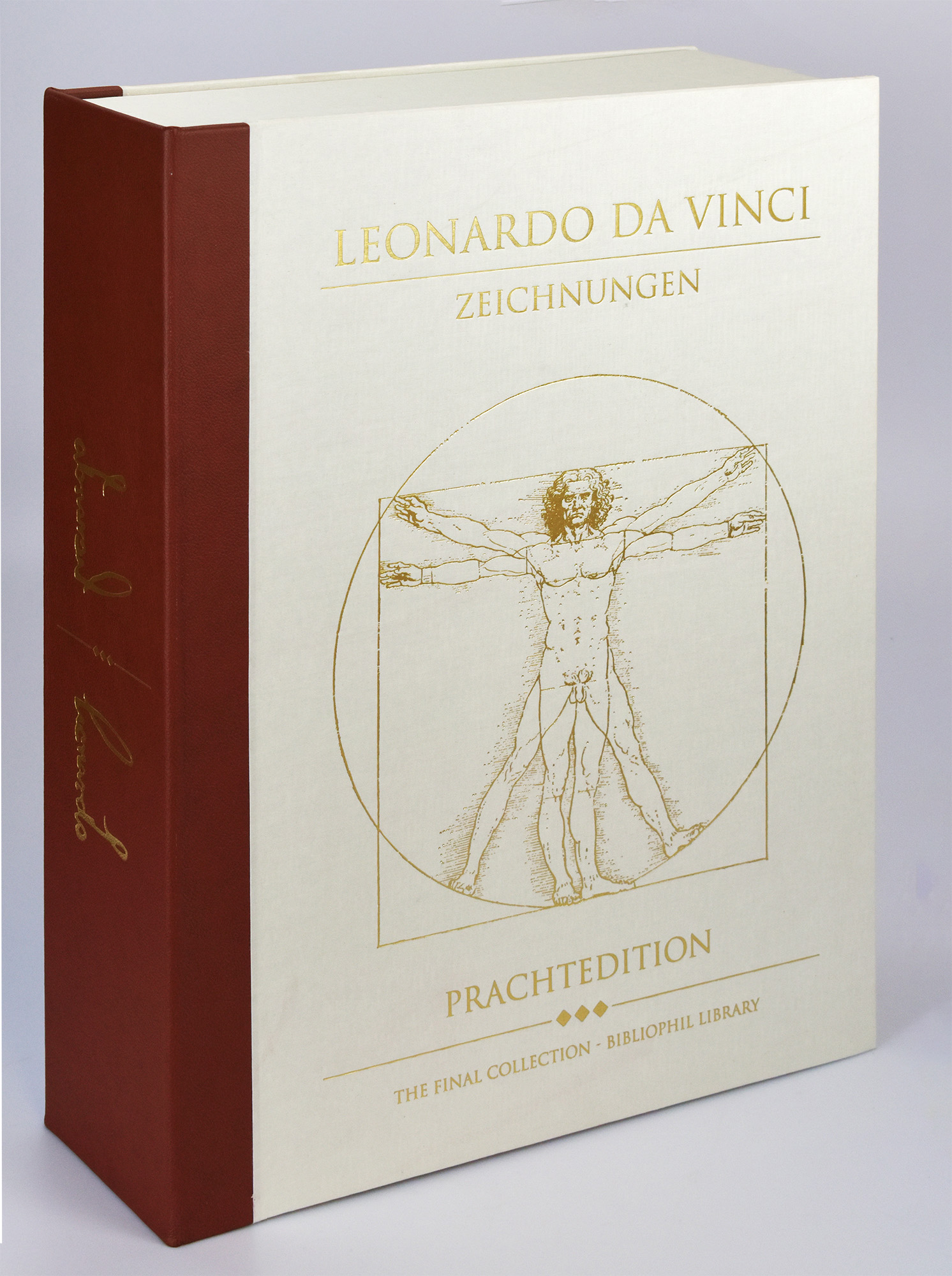 Leonardo da Vinci; Frommel, Sabine: Die Zeichnungen und Miscellania von Leonardo da Vinci. Architektur und Erfindungen. Sabine Frommel unter Mitarbeit von Sara Taglialagamba. 2 Bände. [Kommentarband und Faksimilezeichnungen; komplett]. Stuttgart, Belser Verlag, 2019. 2°. 44 x 31 cm. Mappe: 46 x 34 cm. Kassette: 57 x 43 cm. 266 Seiten, 87 faksimilierte Blatt. Original-Ganzlederband auf fünf Bünden mit goldgeprägtem Deckel- und Rückentitel sowie Rundum-Goldschnitt. Original-Leinenmappe mit goldgeprägtem Deckeltitel und Schleifenverschluss. In Original-Halblederkassette mit Leinenbezug, goldgeprägtem Deckel- und Rückentitel und goldgeprägter Deckelillustration. (= The Final Collection – Bibliophil Library, Teil III).